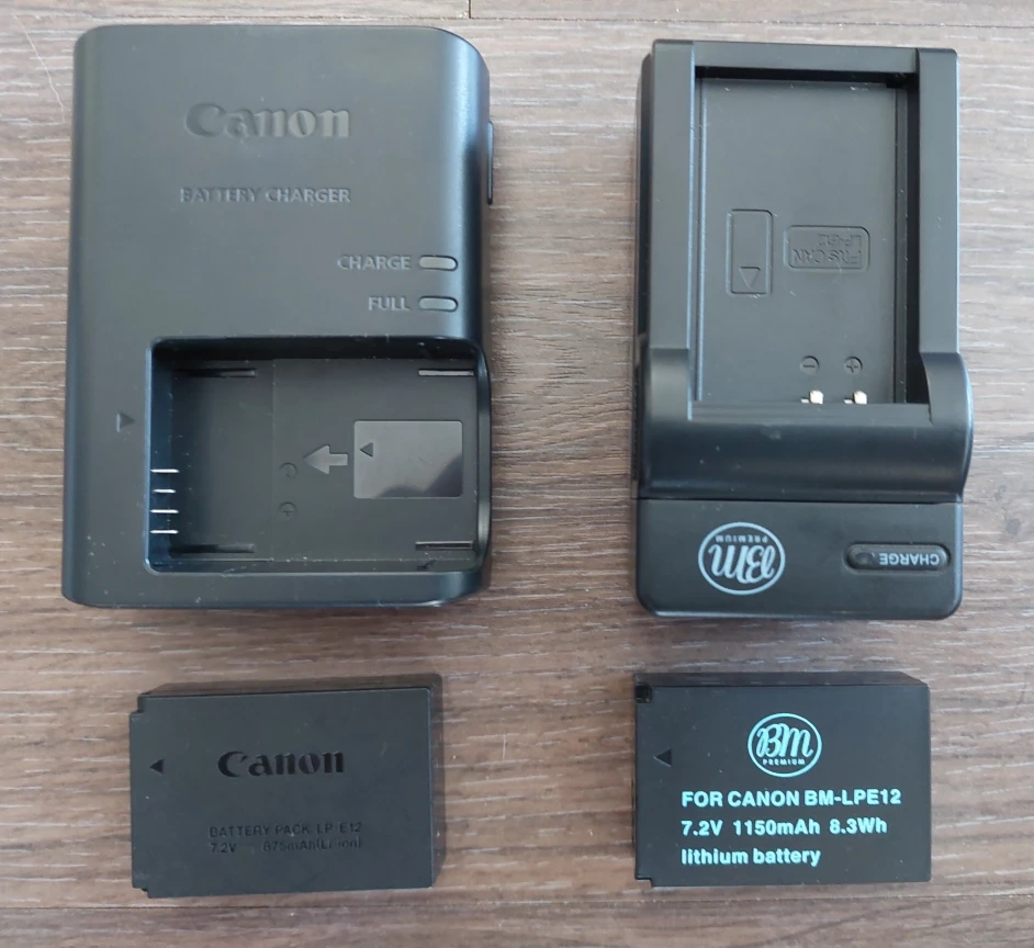 - 2x Canon LP-E12 batteries (1 OEM Canon, 1 BM Premium)