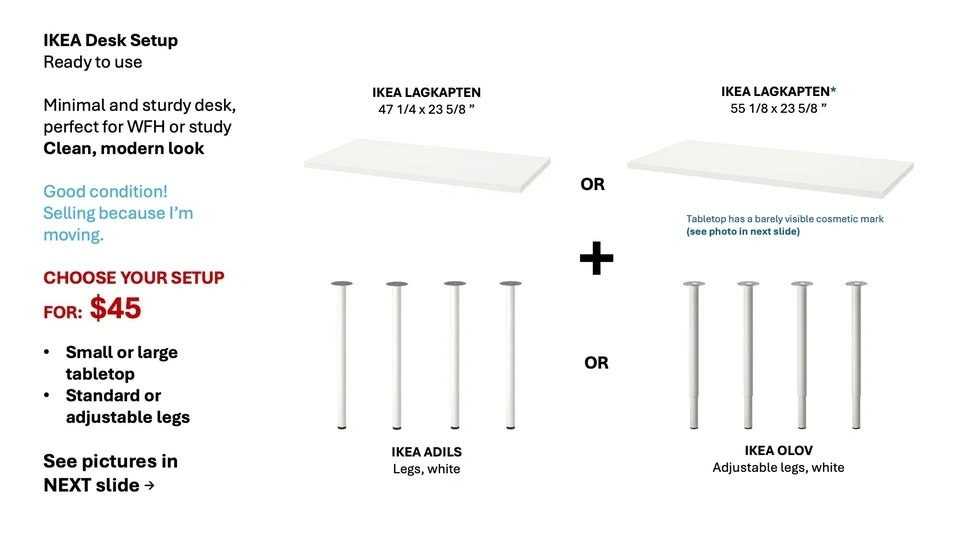 Minimal and sturdy desk, perfect for WFH or study. Clean, modern look. Good condition – lightly used. Choose your setup: Small or large tabletop, Standard or adjustable legs. One tabletop has a small cosmetic mark (see photo), does not affect use. $45. Pickup ASAP (before April 10). Located 1 block from Newark Penn Station. Cash accepted.