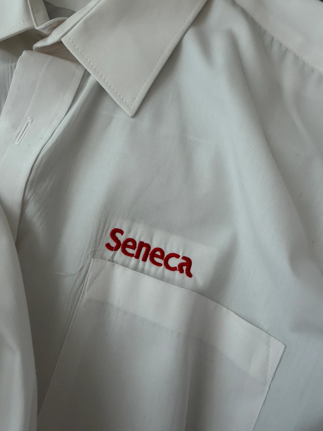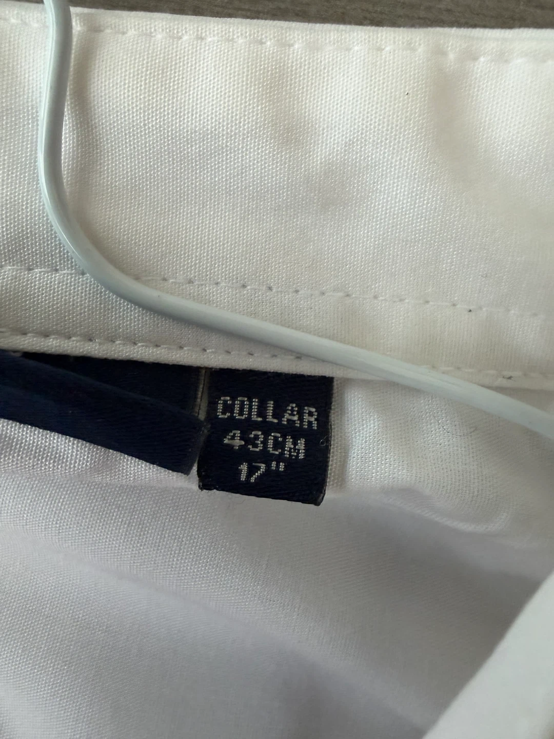 White Seneca dress shirt. Collar size 17 inches or 43cm. This shirt is made of a smooth, durable fabric.