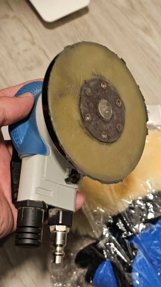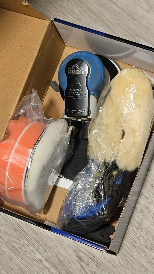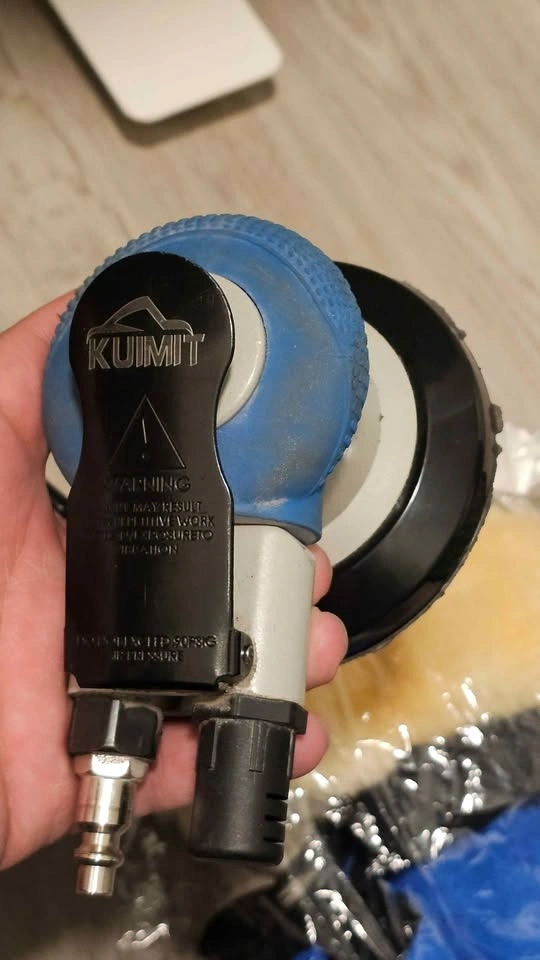 Versatile KUIIMT pneumatic orbital sander kit. Comes with an air-powered sander, an orange foam pad in a bag, and a wool buffing pad in a bag. Good for car detailing or other sanding/polishing projects. Missing part see in photos.