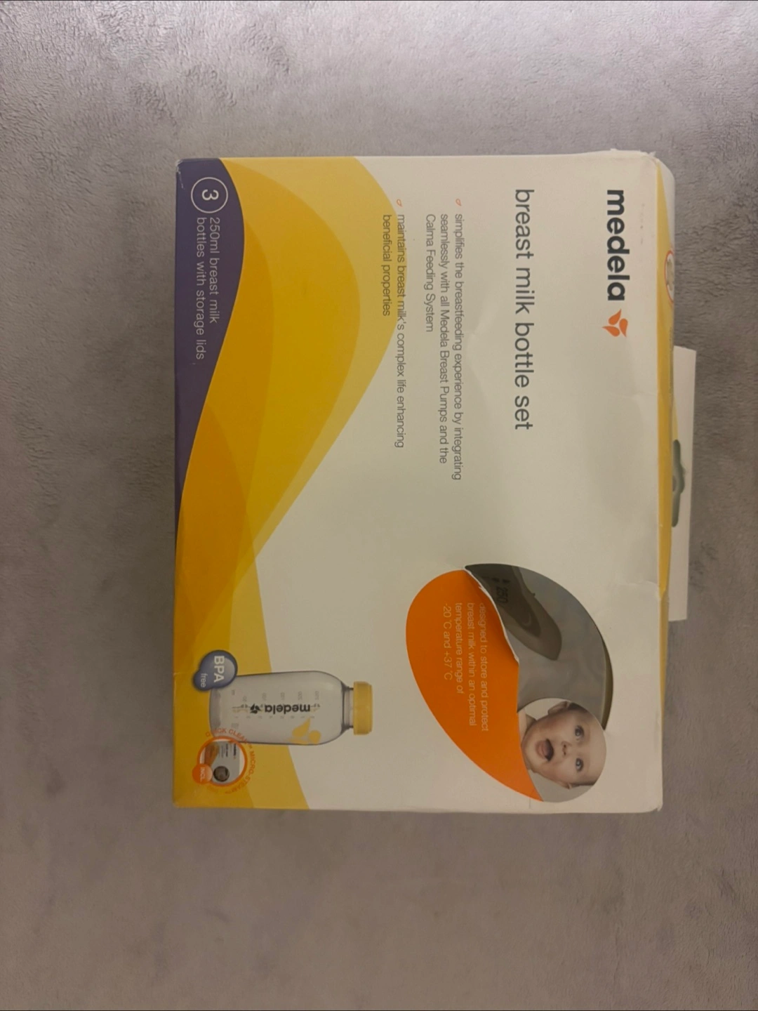 New, unopened box of Medela breast milk bottles. Set includes three 250ml bottles with storage lids. BPA free. Calma system compatible.