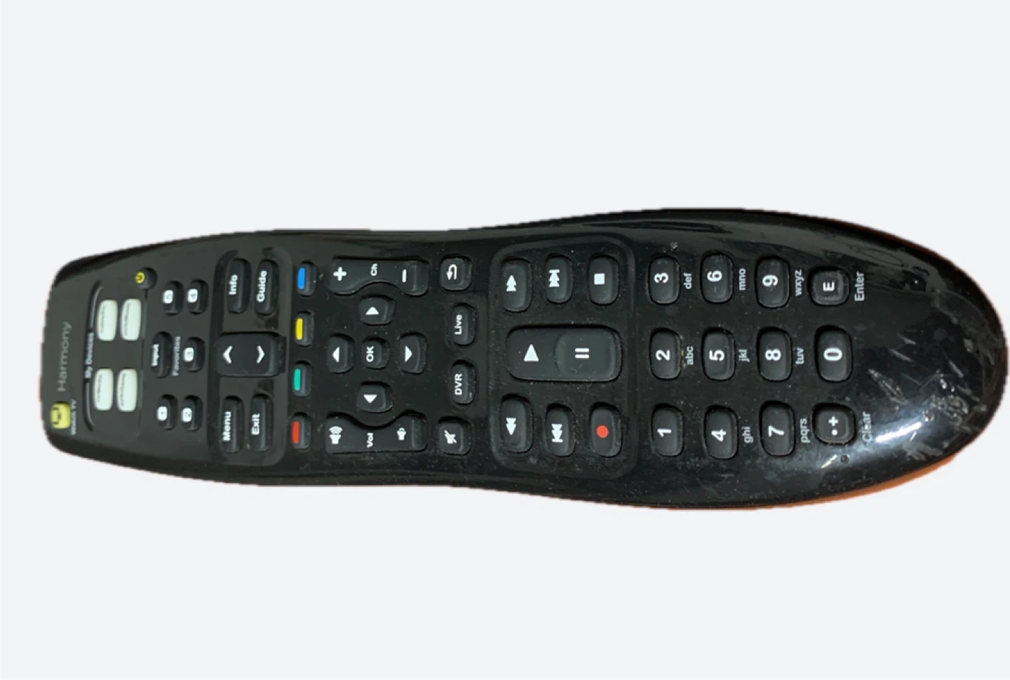 Selling a Logitech Harmony remote. It has buttons for My Devices, Input, and Favorites. You can also access the menu, info, and guide. The remote has buttons for volume, channel, DVR, and live TV. Number buttons are also included.