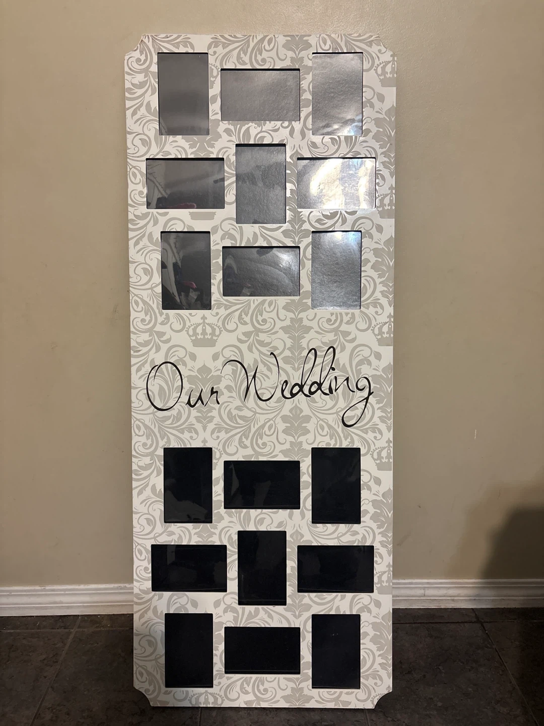 Selling a decorative photo collage frame that says "Our Wedding" at the centre. It has multiple slots for photos of different sizes, perfect for displaying cherished memories from your special day!