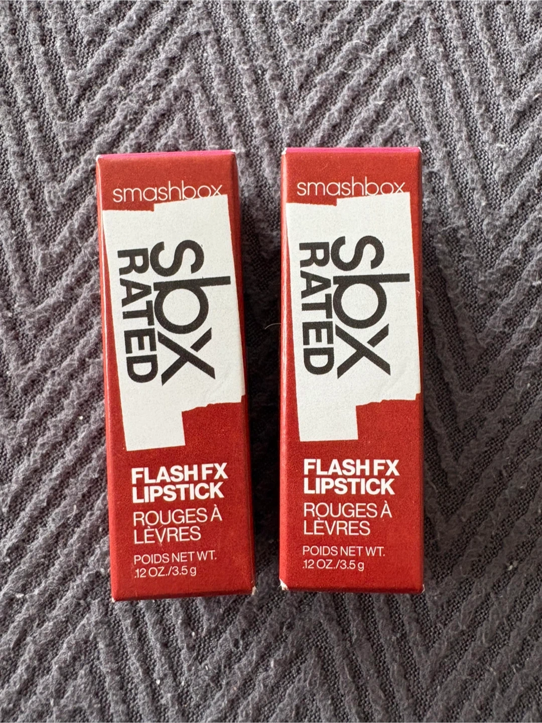 Two Smashbox SBX Rated Flash FX Lipstick boxes included. Each lipstick is 0.12 oz / 3.5 g. The shade name is XPLOSIVE.