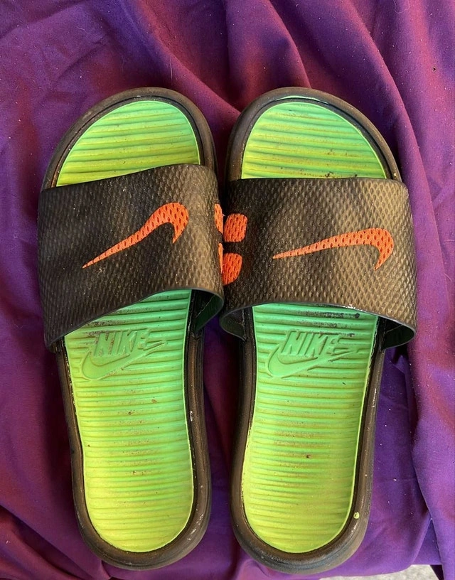 Get ready to slide into comfort with these Nike slides, perfect for chilling after a game or just kicking back. These slides feature a striking black and neon green colour scheme with the iconic orange Nike swoosh. Please note that these slides are in used condition, with visible wear as shown in the photos. They still have plenty of life left for casual wear! *Note: These are USED* If the ad is still up, the slides are still available – no need to ask!