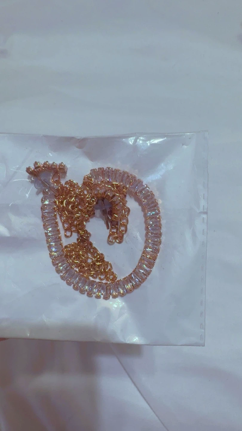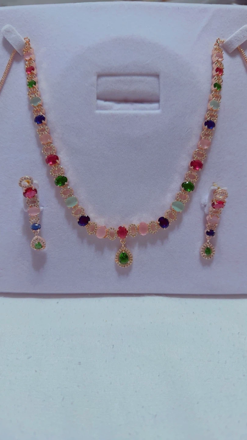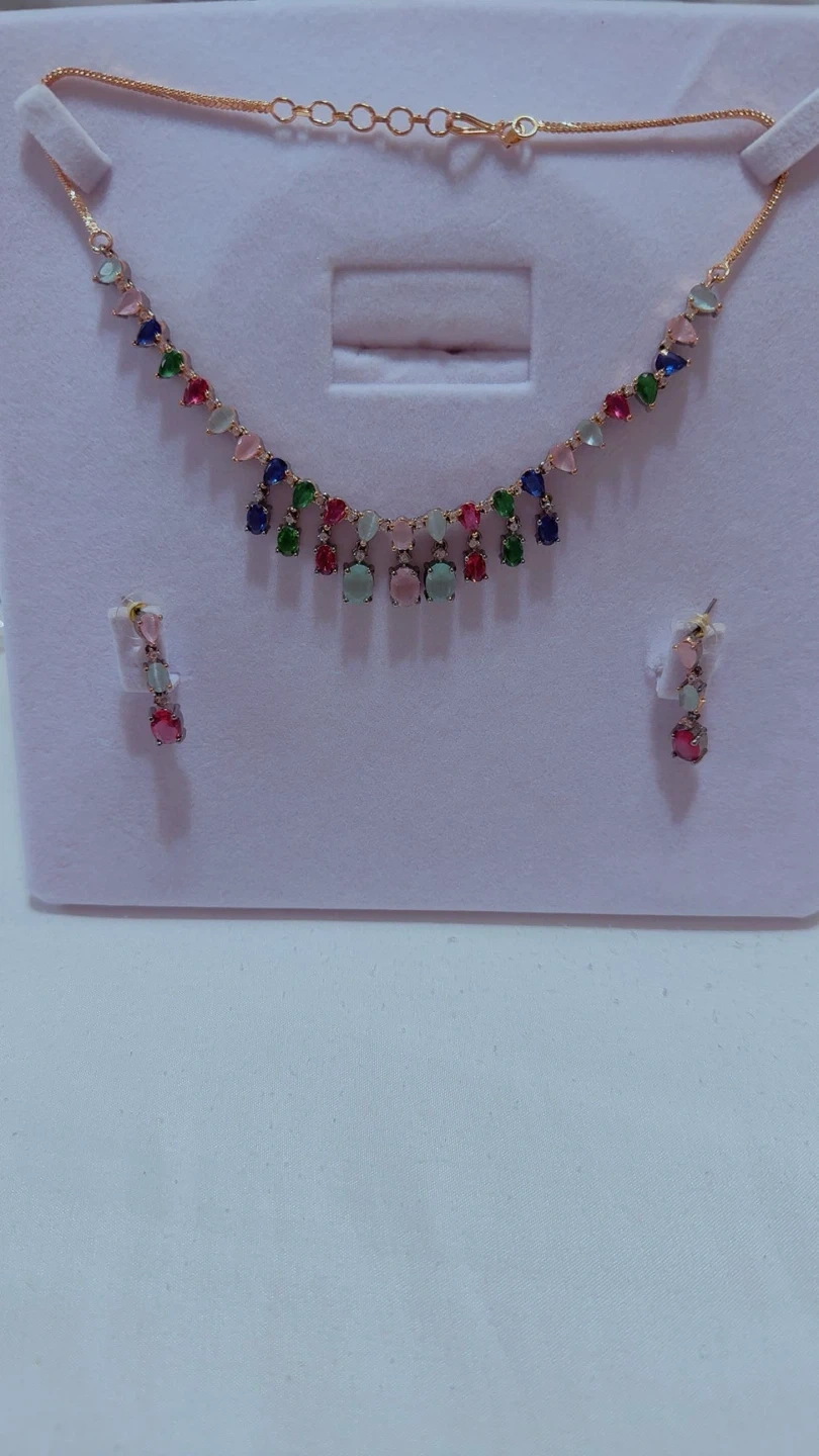 This set includes a necklace and matching earrings. It features colourful gemstones and a rose gold toned chain. It's a lovely accessory for special occasions!