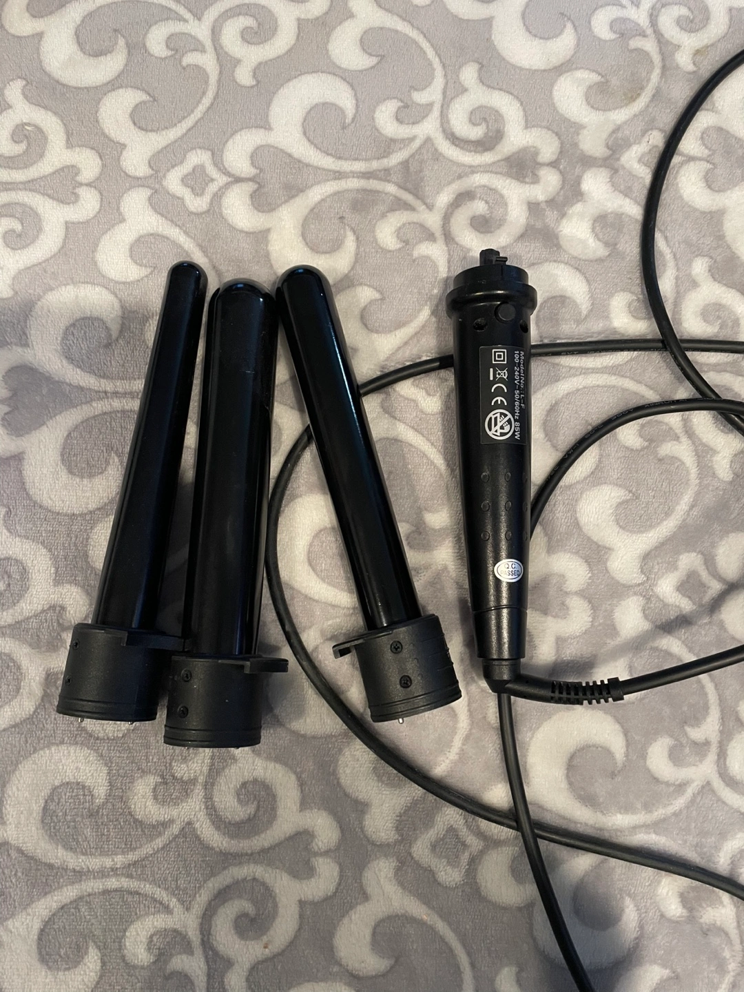 A black hair styling wand set, comes with different sized wand attachments. Includes a power cord. This set is ideal for creating beautiful curls and waves at home.