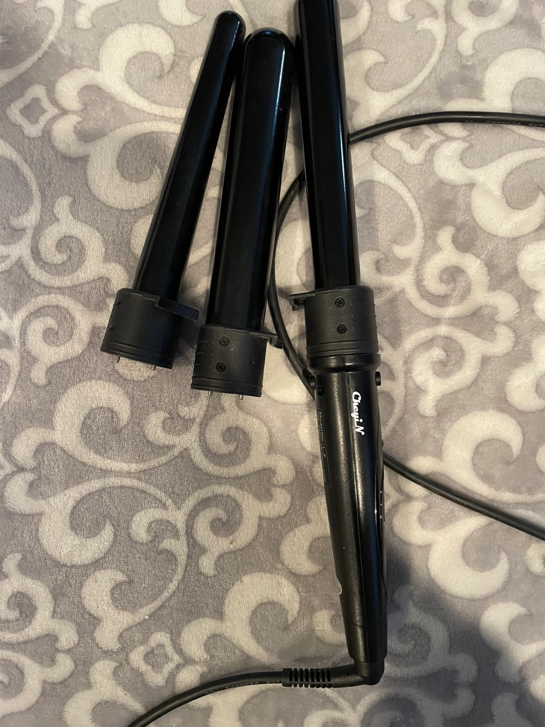 A black hair styling wand set, comes with different sized wand attachments. Includes a power cord. This set is ideal for creating beautiful curls and waves at home.