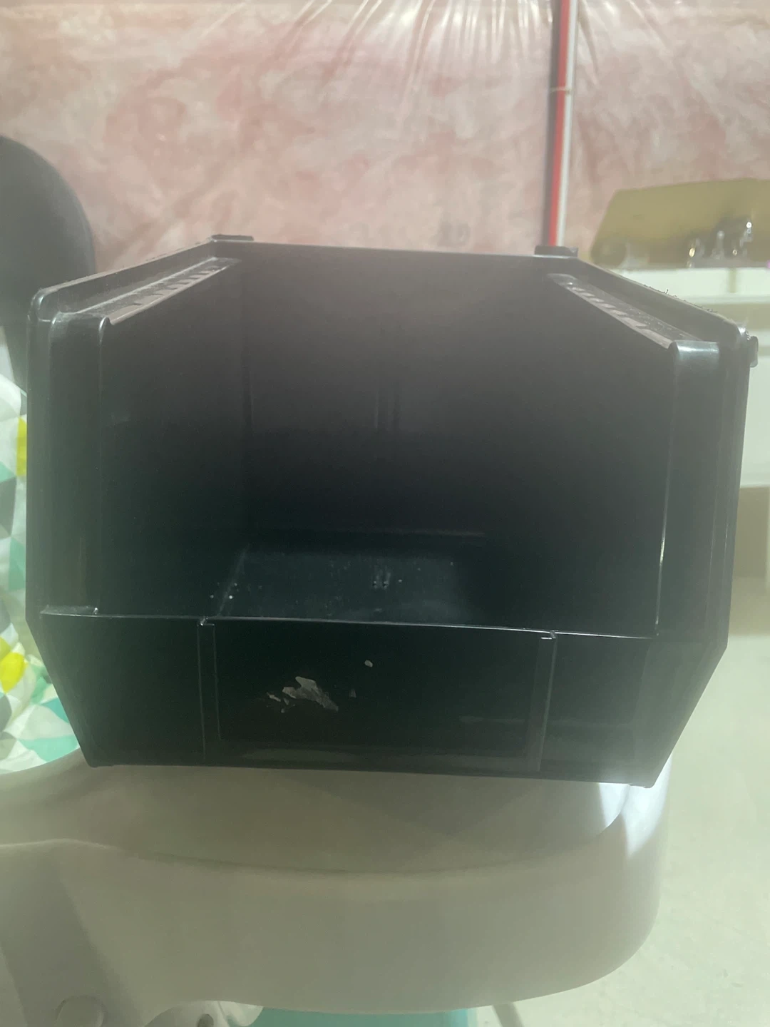 Black plastic storage bin. This bin is great for organizing small items. It's made of durable plastic. We have 25 bins.Uline bins