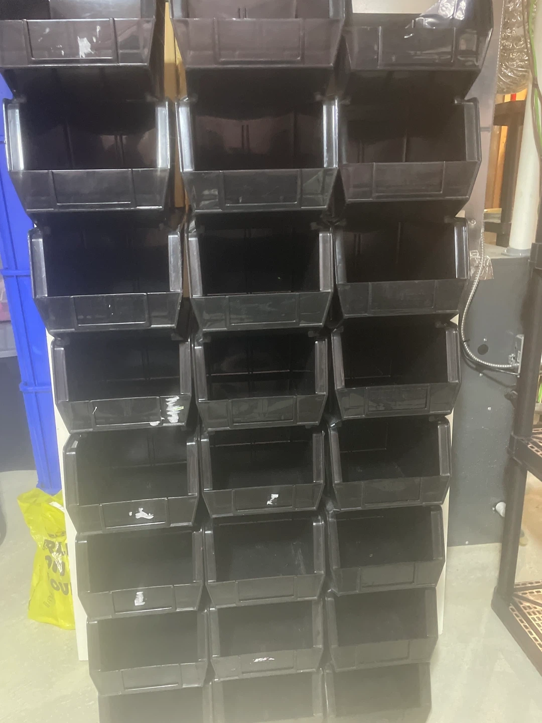 Black plastic storage bin. This bin is great for organizing small items. It's made of durable plastic. We have 25 bins.Uline bins