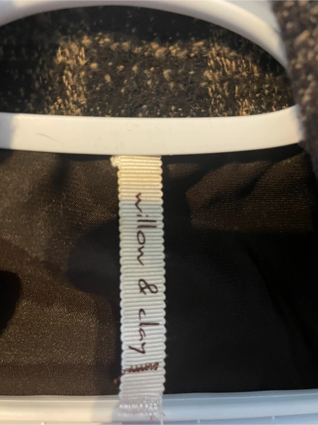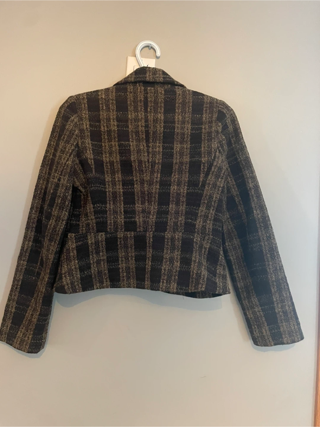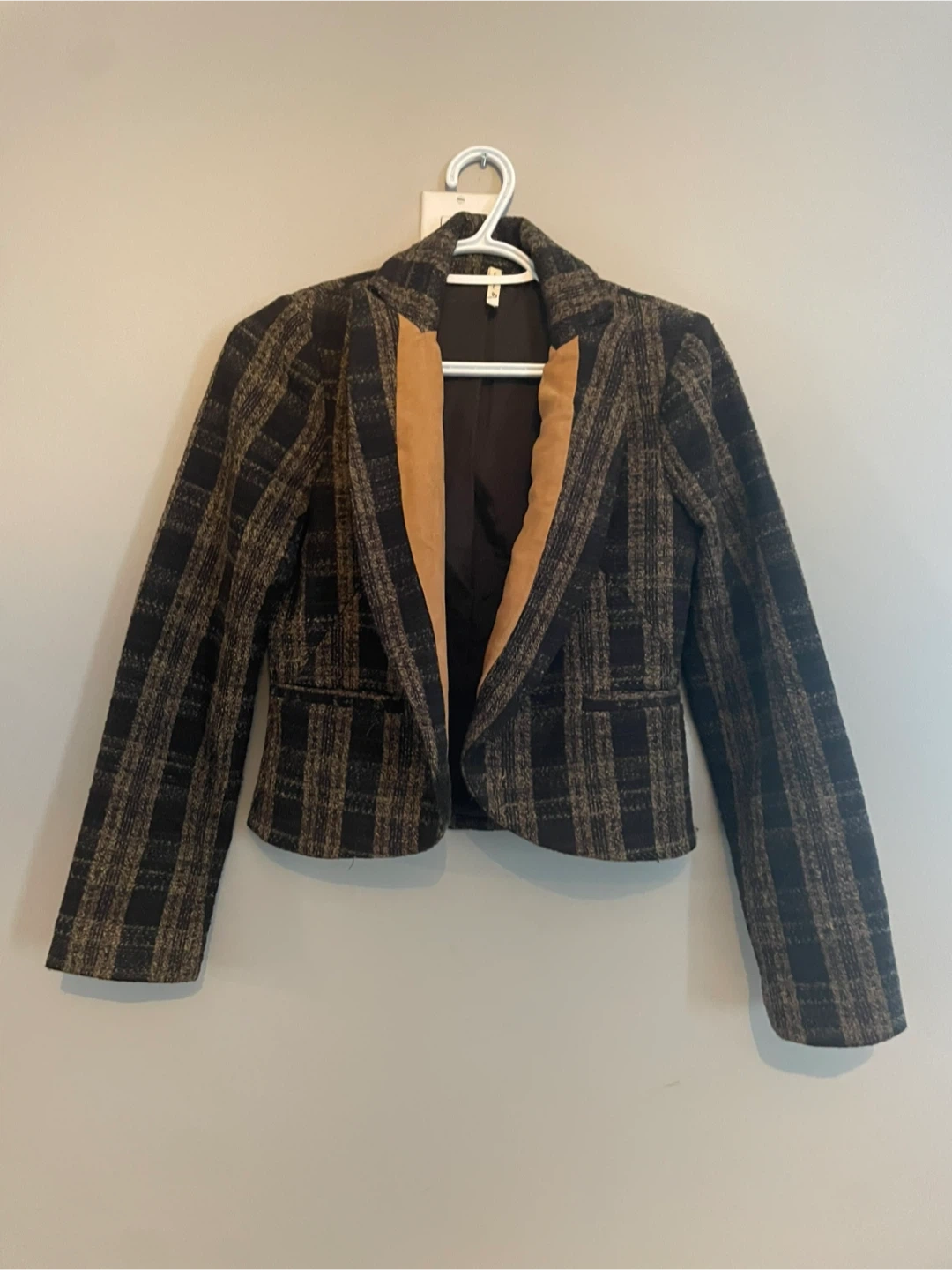 Stylish plaid blazer by Willow & Clay. Features a tan contrast lapel and a classic fitted silhouette. Perfect for layering over tops or dresses. Not sure the size but fits like an XS. Dry clean only