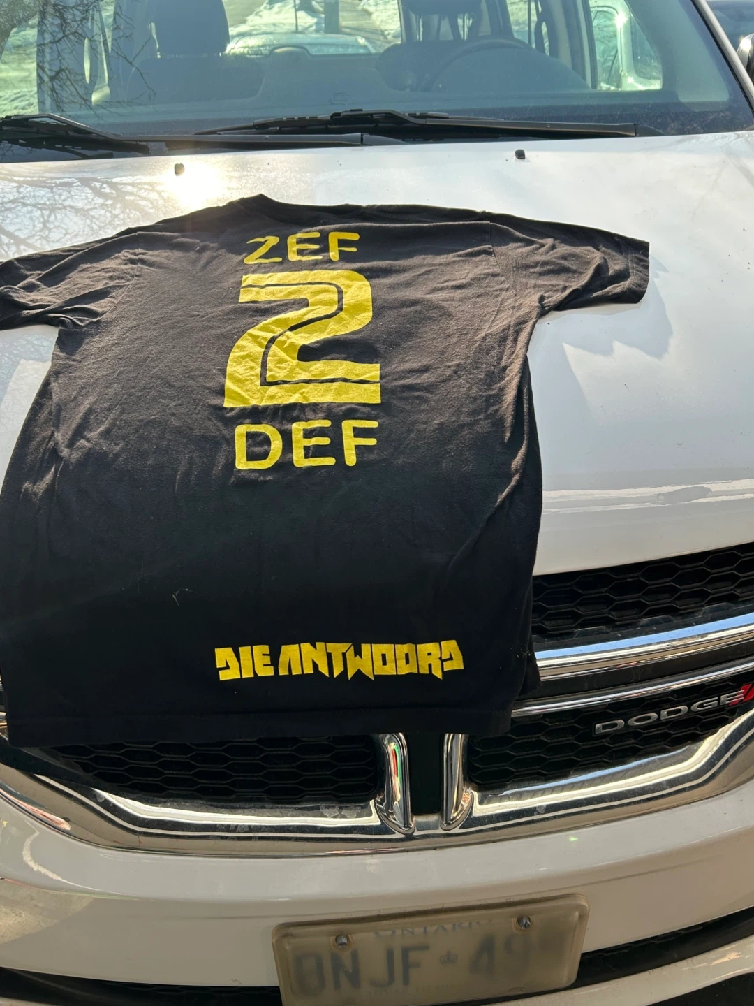 Black t-shirt with yellow ZEF 2 DEF graphic on the back and Die Antwoord logo on the front. Made of 100% pre-shrunk ringspun cotton. Made in Mexico.