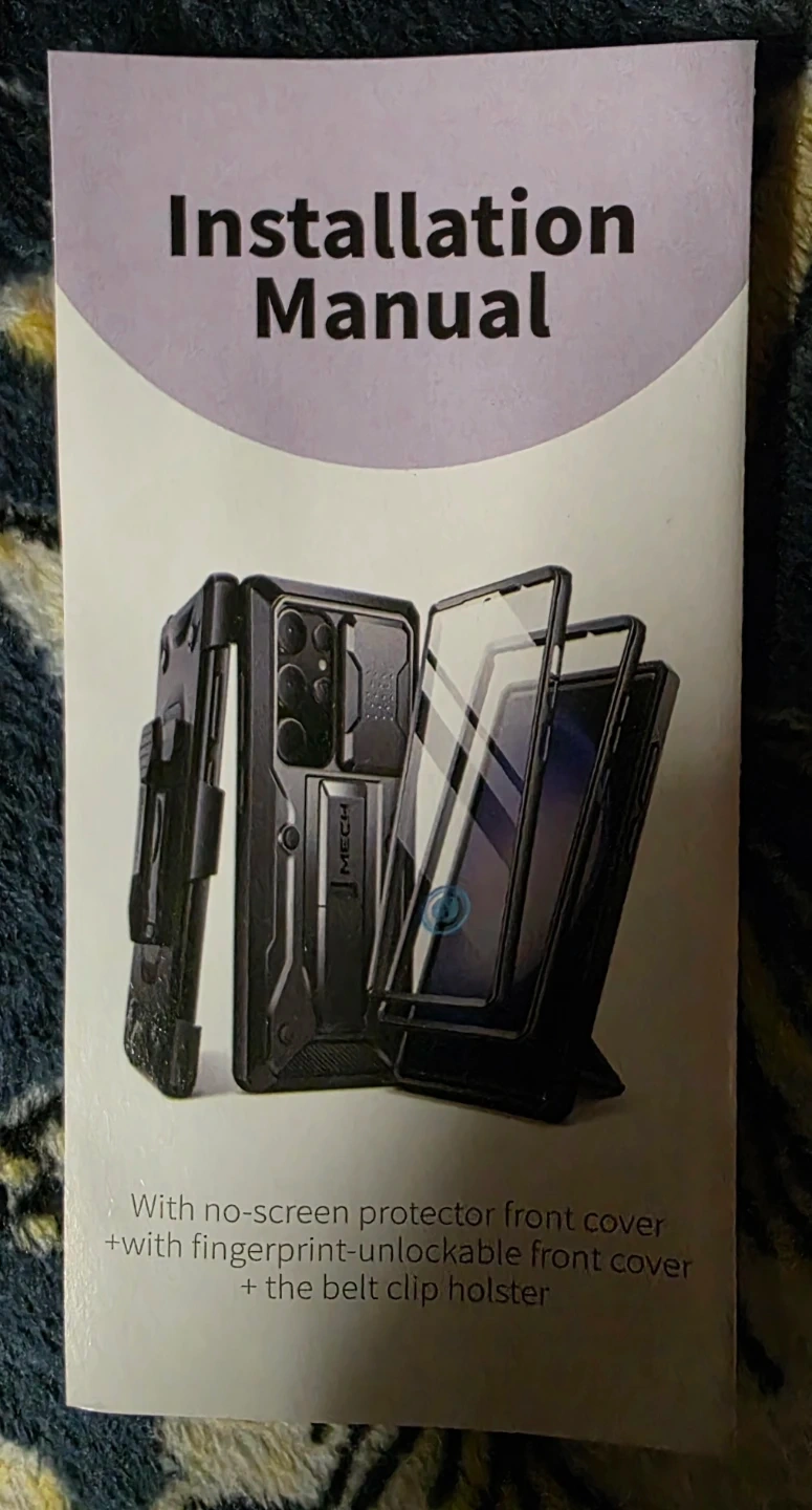 This is a black TONGATE case designed for the Samsung Galaxy S23 Ultra. It includes a belt clip holster and an installation manual. The case offers protection with a no-screen protector front cover and a fingerprint-unlockable front cover.