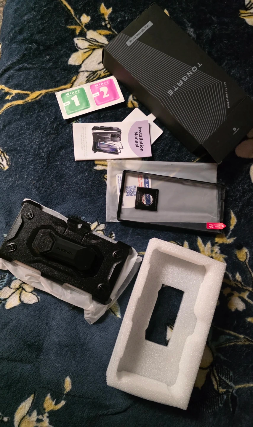 This is a black TONGATE case designed for the Samsung Galaxy S23 Ultra. It includes a belt clip holster and an installation manual. The case offers protection with a no-screen protector front cover and a fingerprint-unlockable front cover.