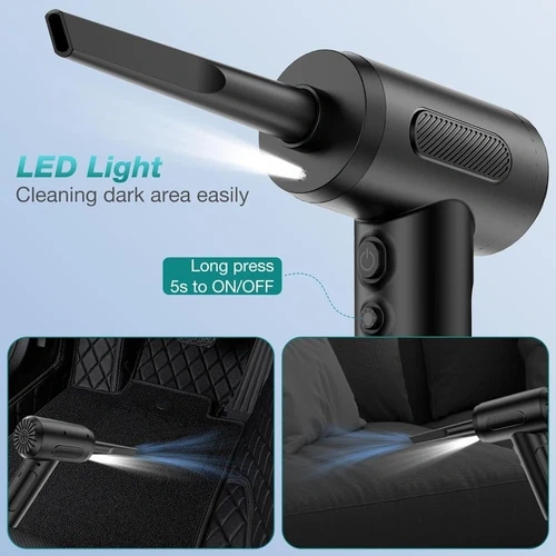 This is a 3-in-1 cordless portable air blower that functions as a compressed air duster, a pump, and a vacuum cleaner. It features 3 levels of adjustable power and 68W of power. Includes an LED light and comes with 10 kits. Great for cleaning keyboards, cars, and as a replacement for canned air. Let me know if you're interested!