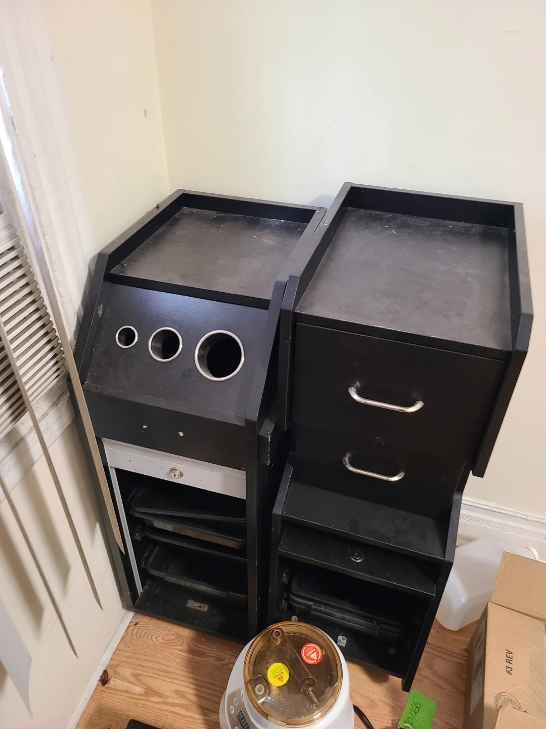 Selling a set of salon equipment. It includes a station with three holes on top and a cabinet with drawers. Good for a salon or personal use