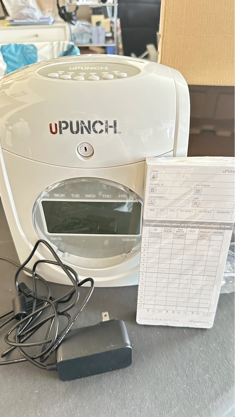 This is a UPUNCH HN4000 time clock terminal. It includes the main unit, a power adapter, and a key. It also comes with a stack of time tracking cards.