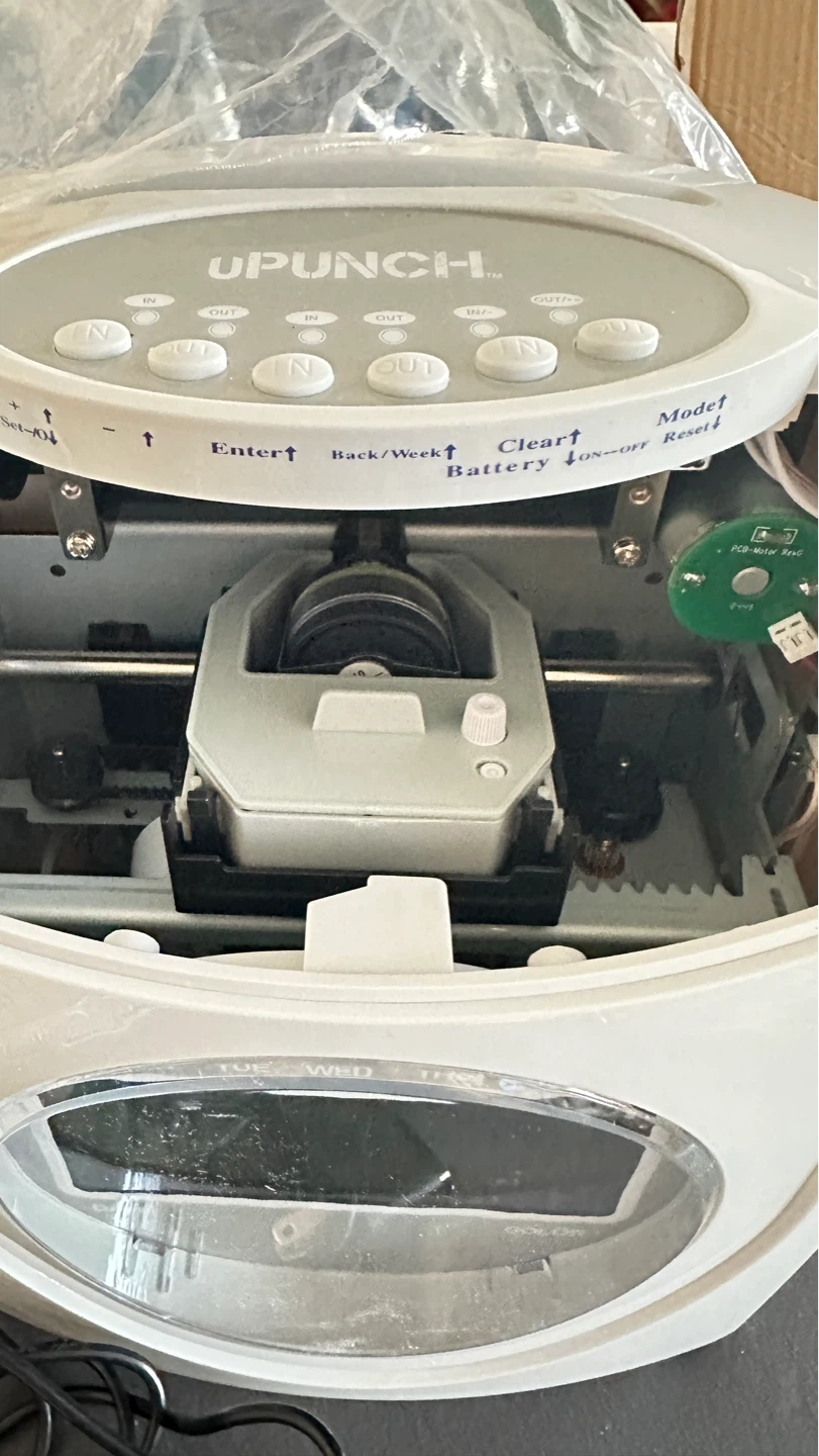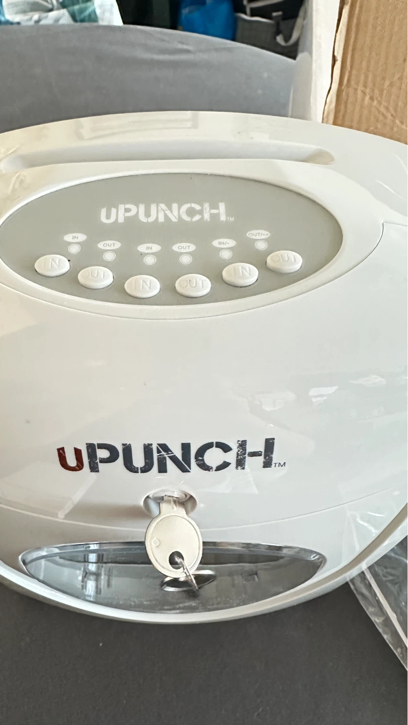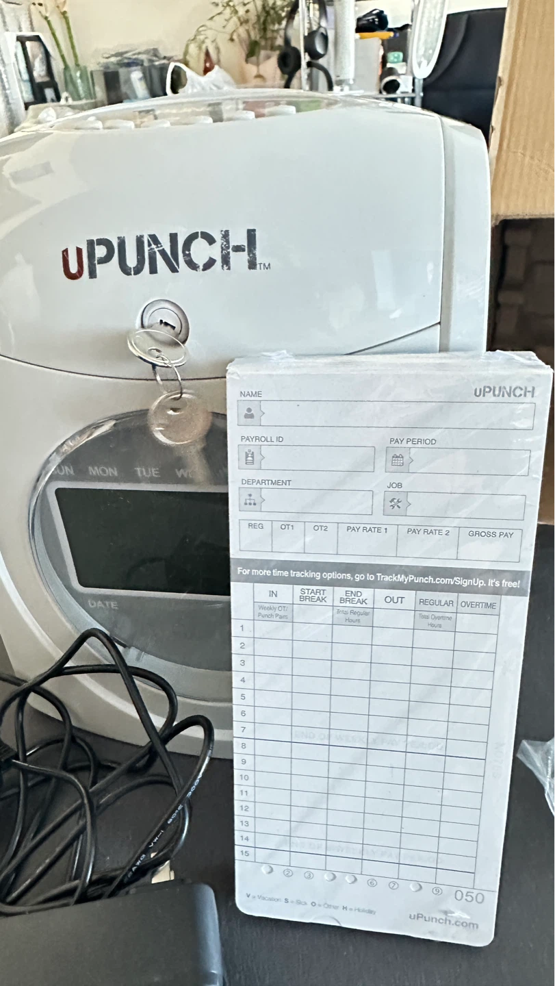 This is a UPUNCH HN4000 time clock terminal. It includes the main unit, a power adapter, and a key. It also comes with a stack of time tracking cards.