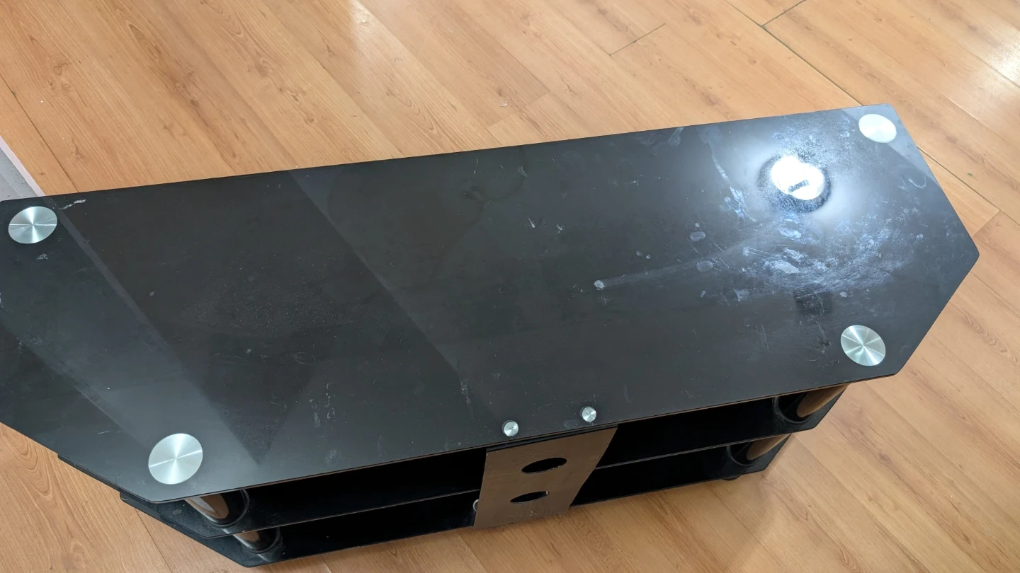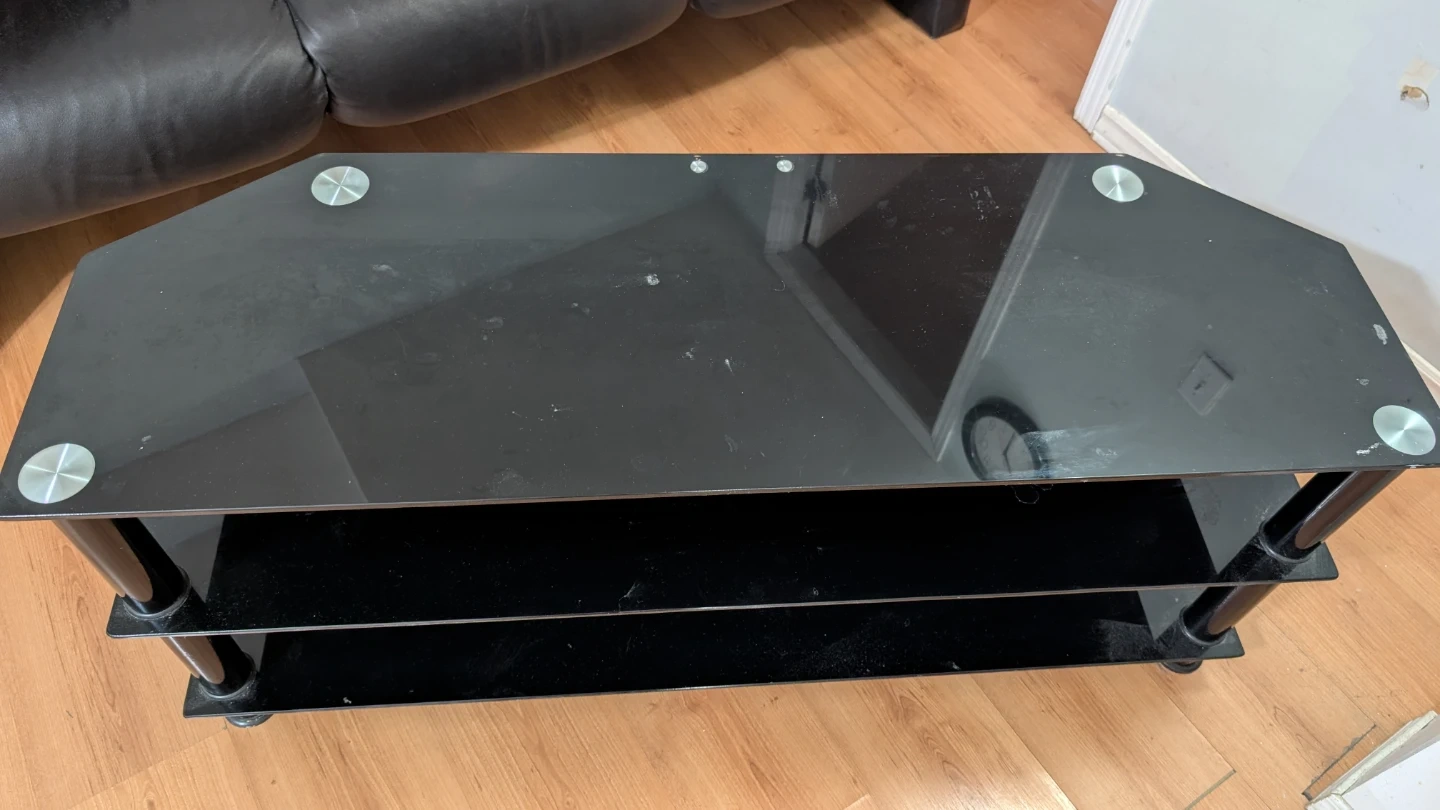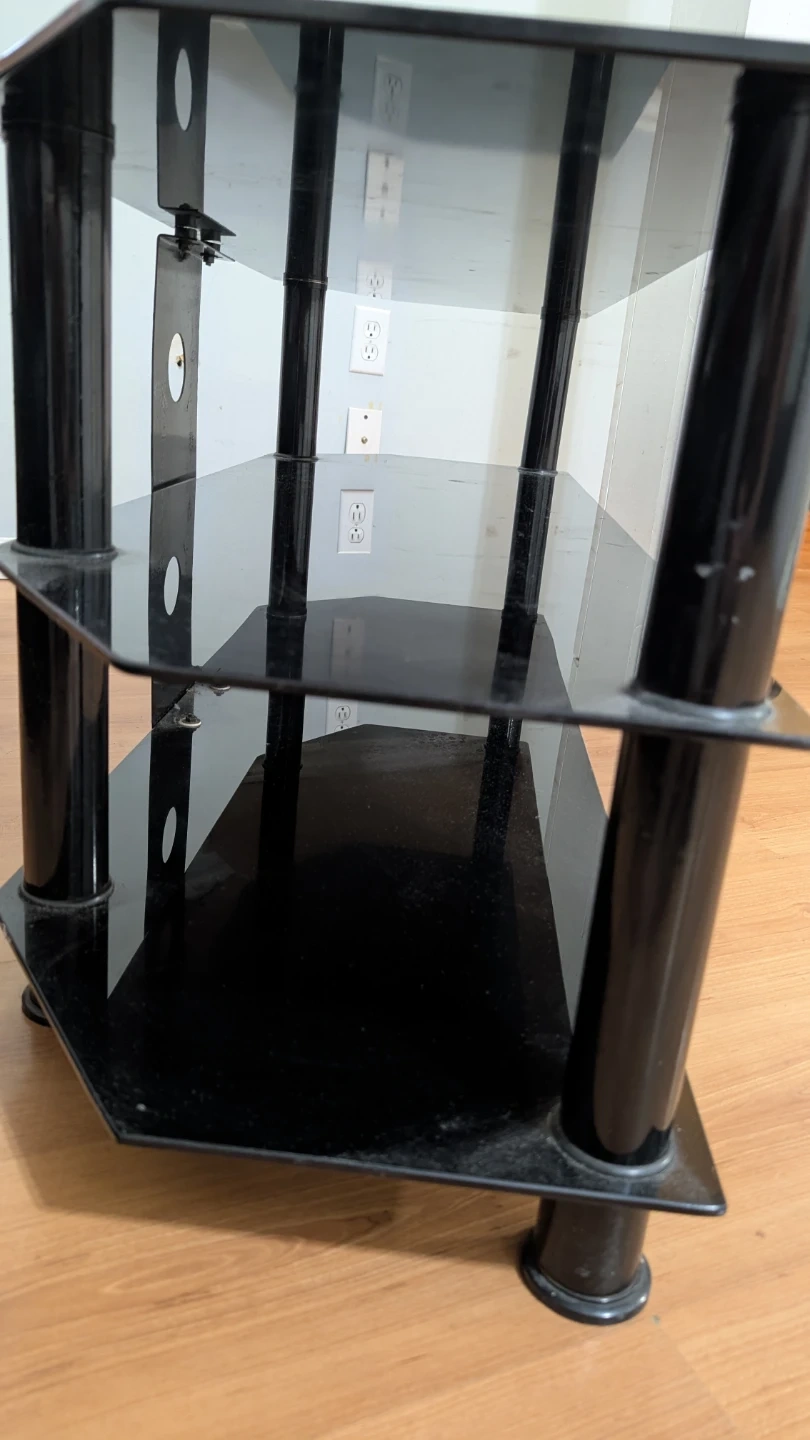 This is a 3-tier black glass TV stand with metal poles. It's great for holding your TV and media devices. The shelves are made of tempered glass. It's designed to fit nicely in a corner or against a wall. It's in very cheap price. Don't miss this opportunity.