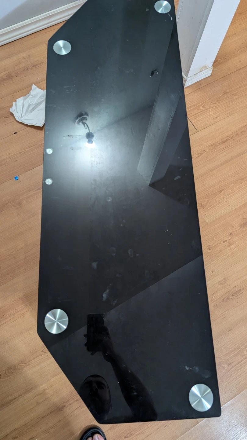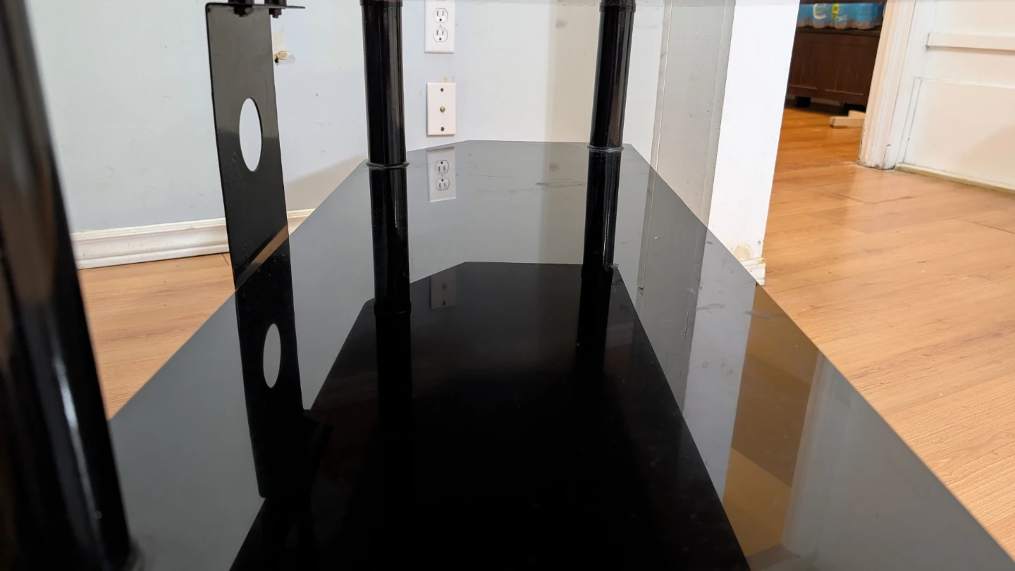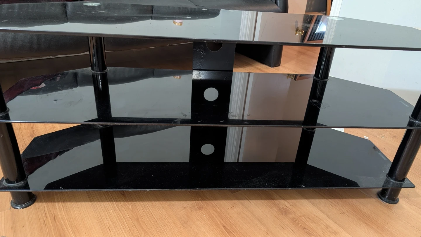 This is a 3-tier black glass TV stand with metal poles. It's great for holding your TV and media devices. The shelves are made of tempered glass. It's designed to fit nicely in a corner or against a wall. It's in very cheap price. Don't miss this opportunity.