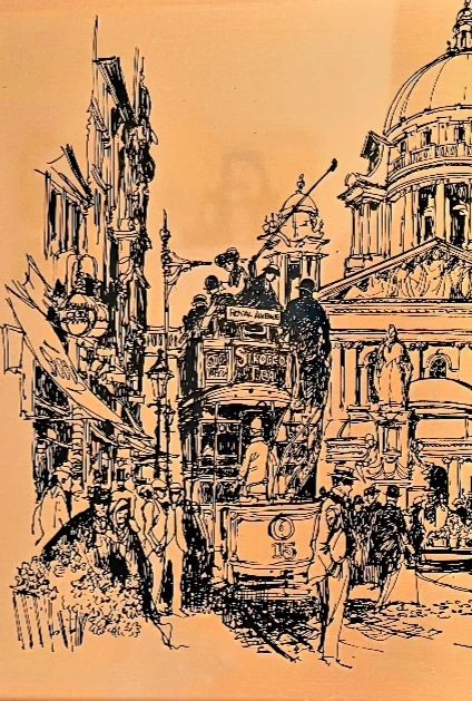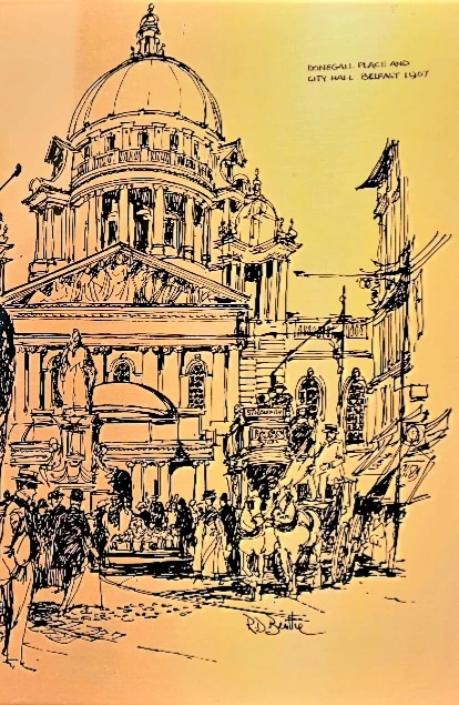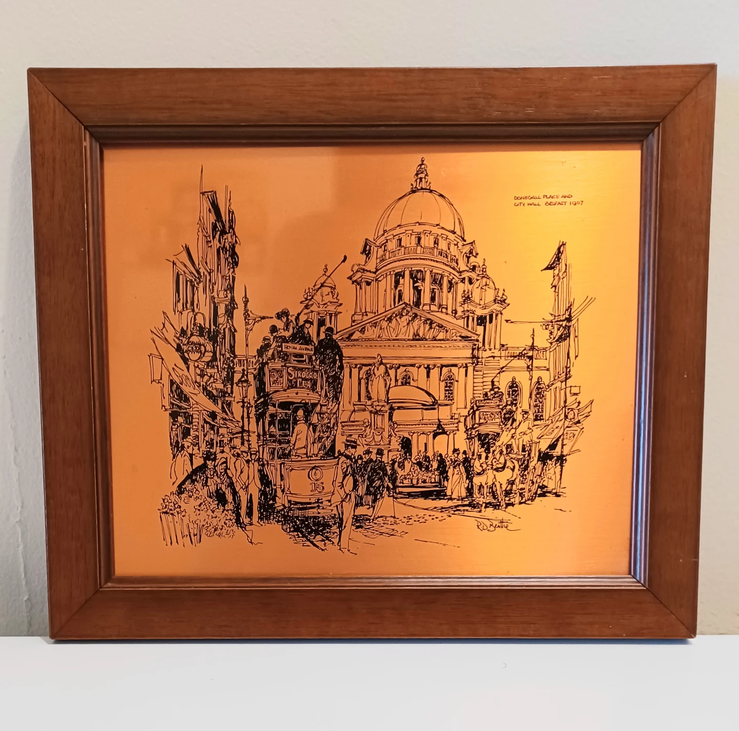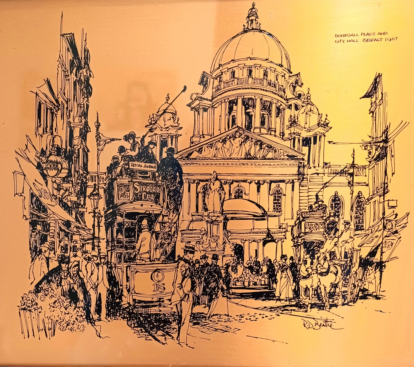 This framed Sk-Exketch print showcases a detailed sketch of Belfast City Hall and Donegal Place in 1907. This piece, crafted in Northern Ireland, captures a historical street scene. The artwork is in Excellent condition