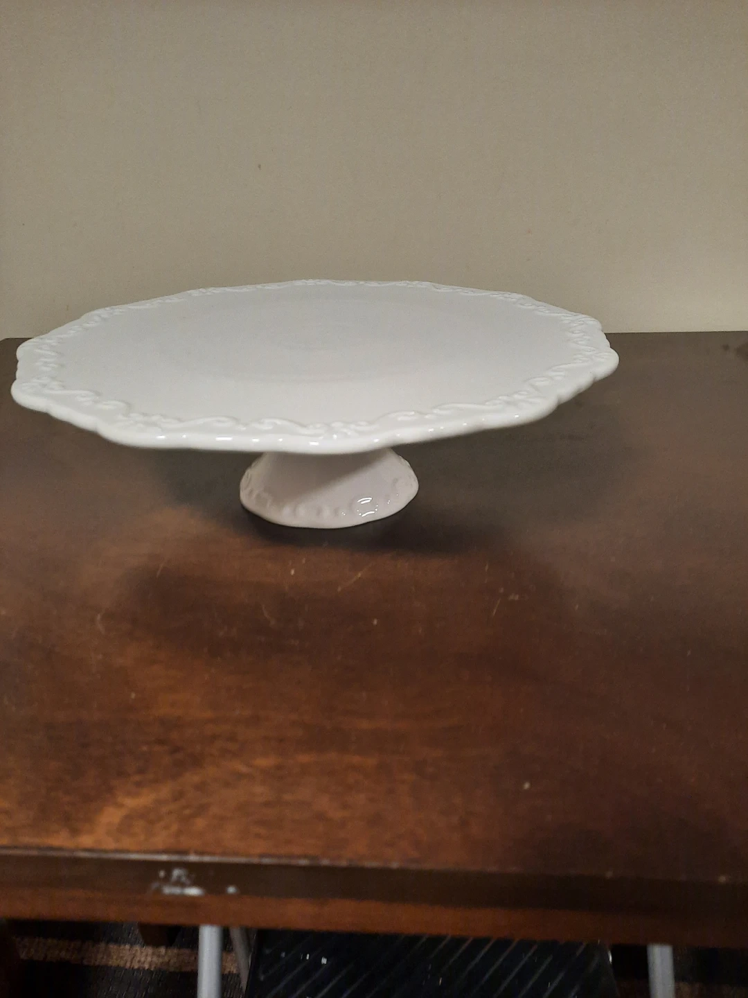 A lovely white pedestal cake stand. It features an elegant embossed pattern around the rim of the plate. This stand is perfect for serving desserts at parties or special occasions!