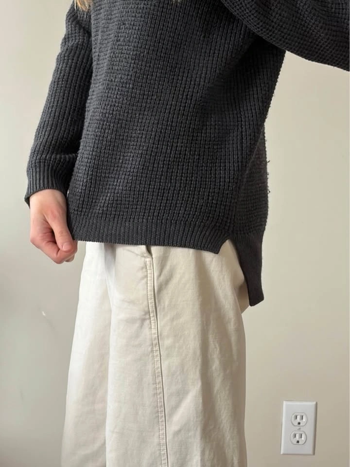 Well loved sweater for sale! Dark grey, high/low bottom with slit in each side. 100% wool with yarn from Italy! Bought from Wilfred Free, and is a size small! Has some pilling in certain spots, but besides that, great condition! $20 OR best OFFER! Pick up is preferred, but can drop off in the Victoria area! Make sure to take a look at ALL my other listings. Selling a BUNCH of good quality clothing 😊