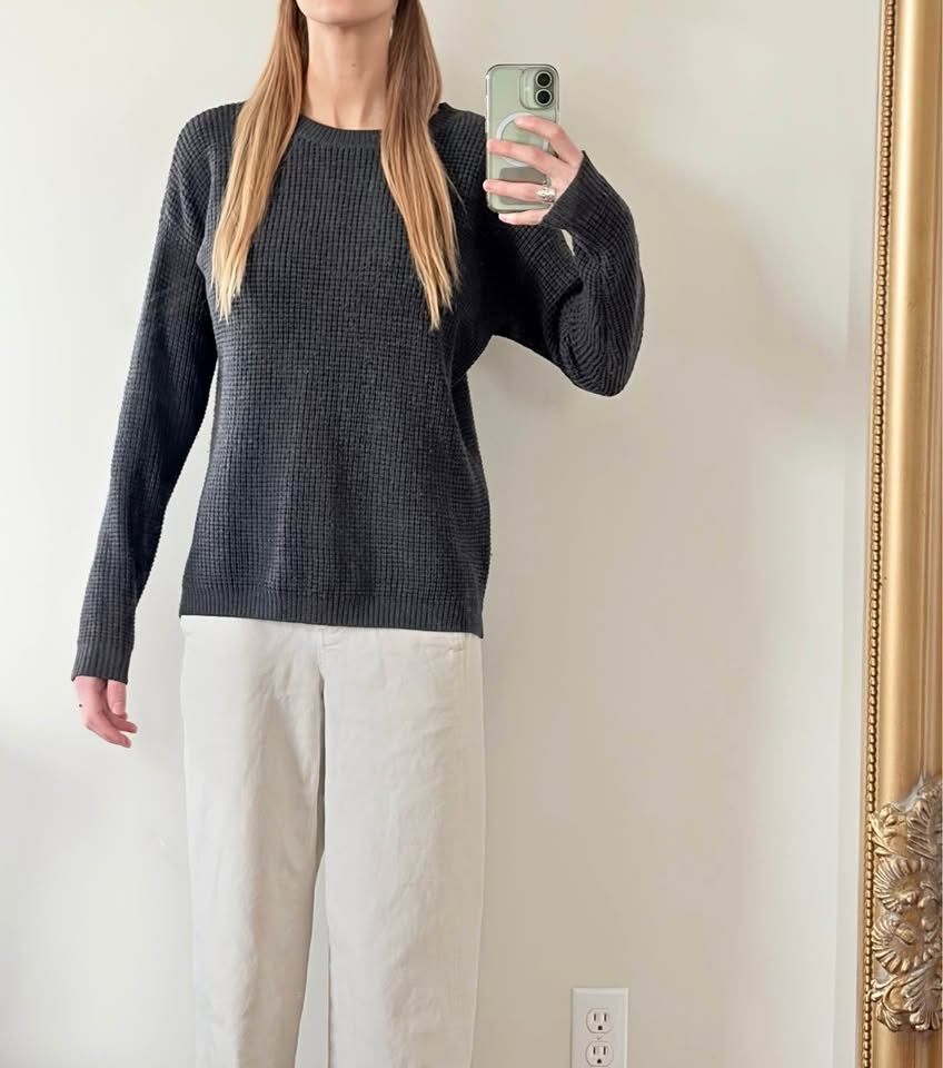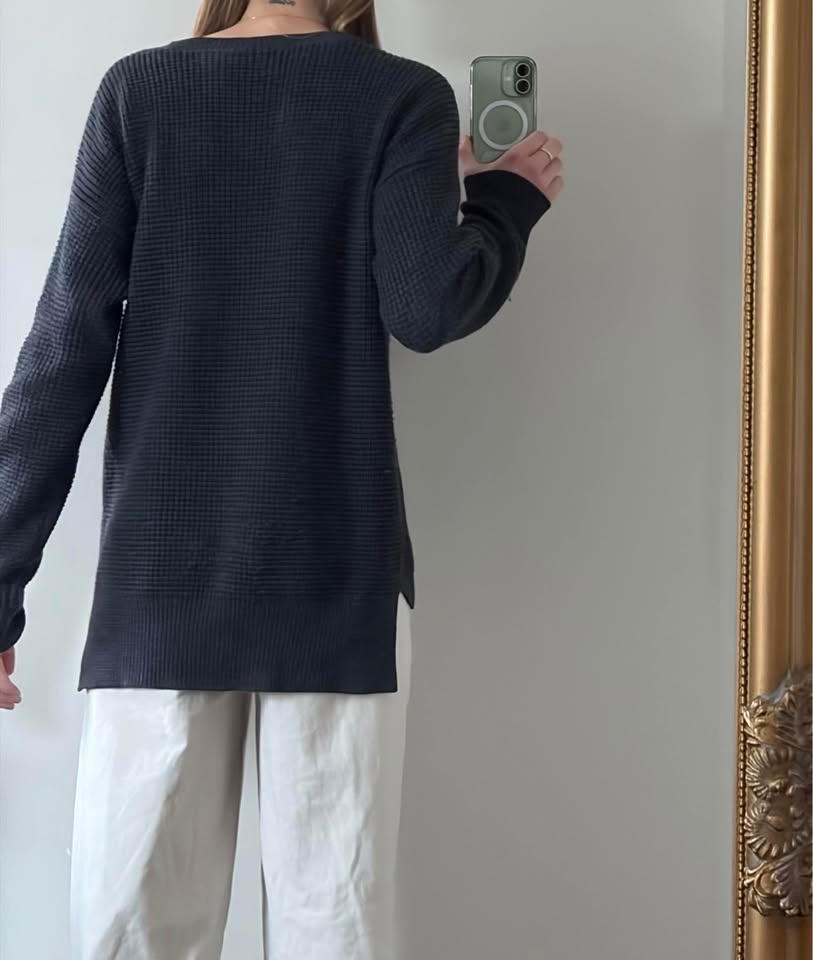 Well loved sweater for sale! Dark grey, high/low bottom with slit in each side. 100% wool with yarn from Italy! Bought from Wilfred Free, and is a size small! Has some pilling in certain spots, but besides that, great condition! $20 OR best OFFER! Pick up is preferred, but can drop off in the Victoria area! Make sure to take a look at ALL my other listings. Selling a BUNCH of good quality clothing 😊