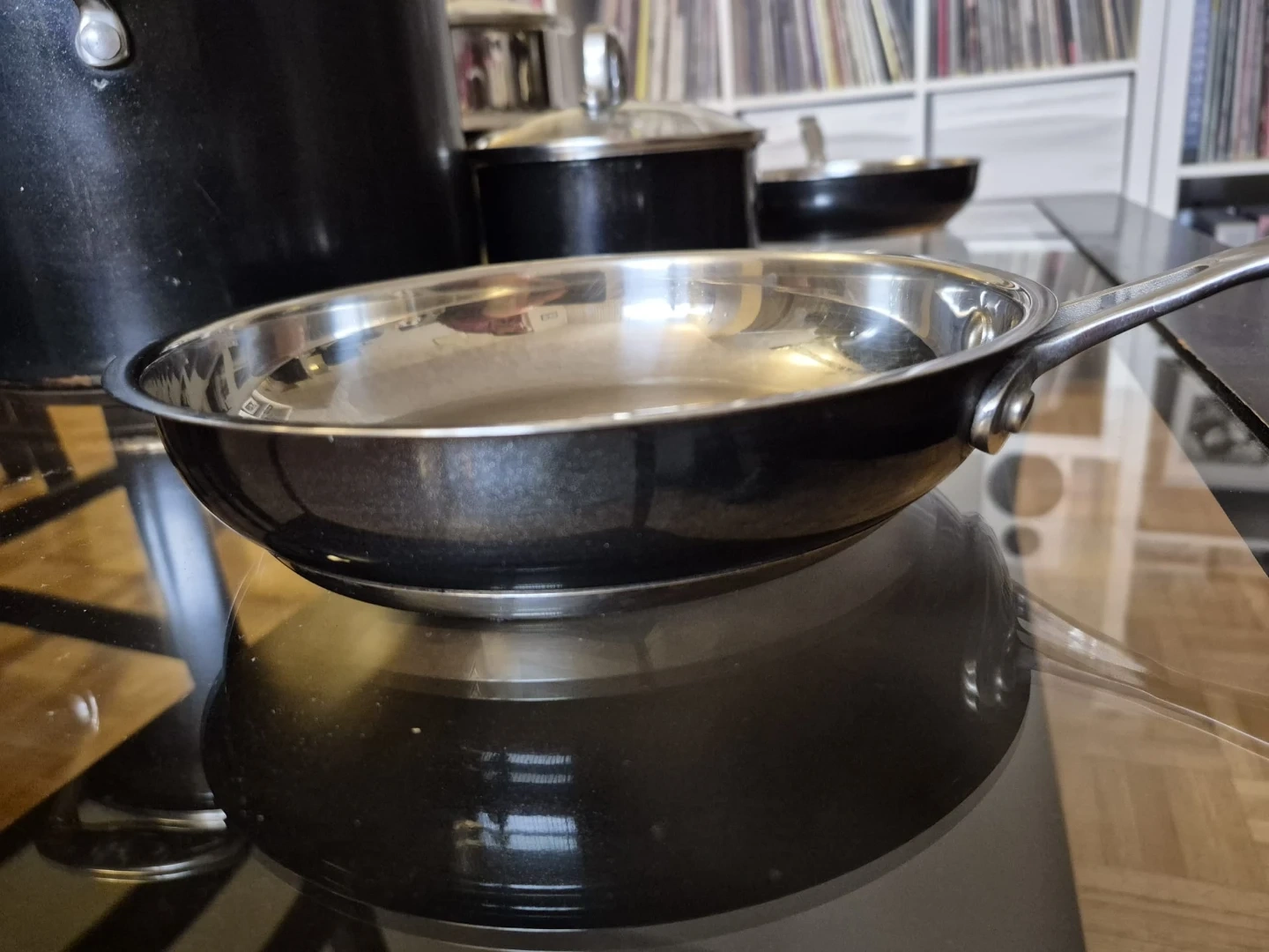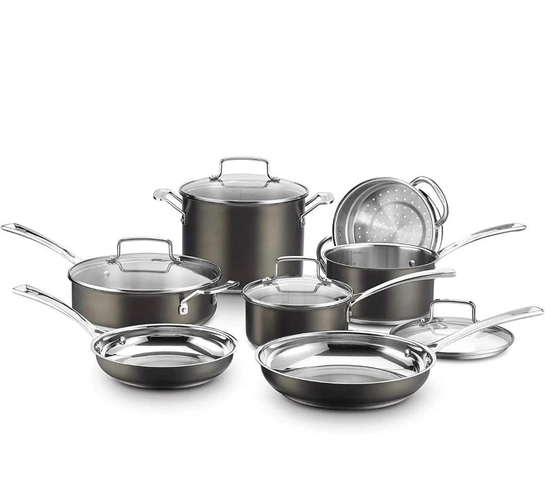 Cuisinart stainless steel enameled cookware set. Complete set with lids. The black enamel on the outside is chipped in some spots, that is the only issue