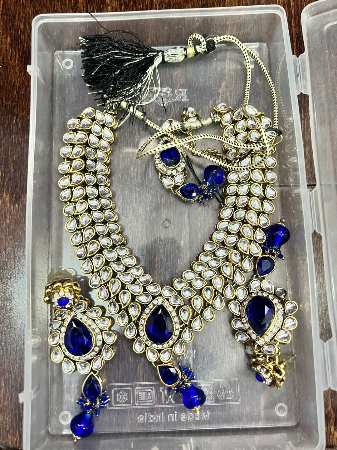 This is a beautiful Indian jewelry set featuring a statement necklace and matching earrings. The set is adorned with deep blue gemstones and clear faux diamonds set in a gold-toned metal. It's perfect for special occasions and cultural events!