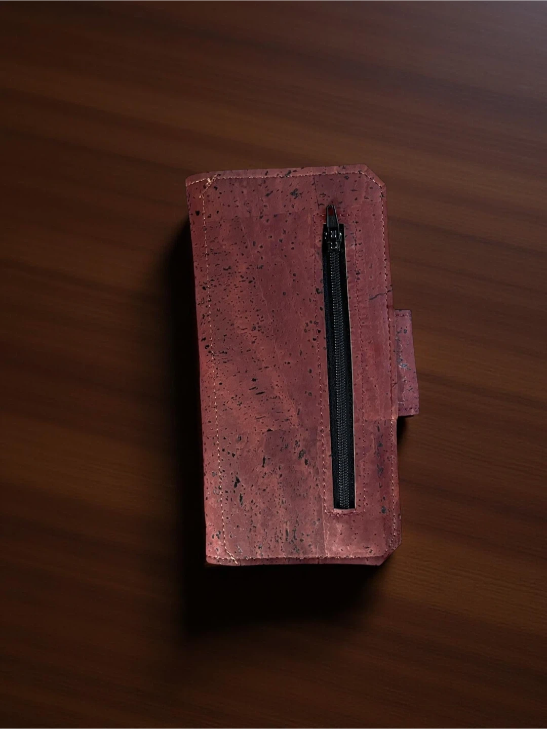 This cork clutch wallet features a snap closure and a zippered coin pocket. It's lined with 10 card slots and a clear ID window and 2 pockets for cash or checkbook. Material is beautiful, sustainable cork (vegan leather).