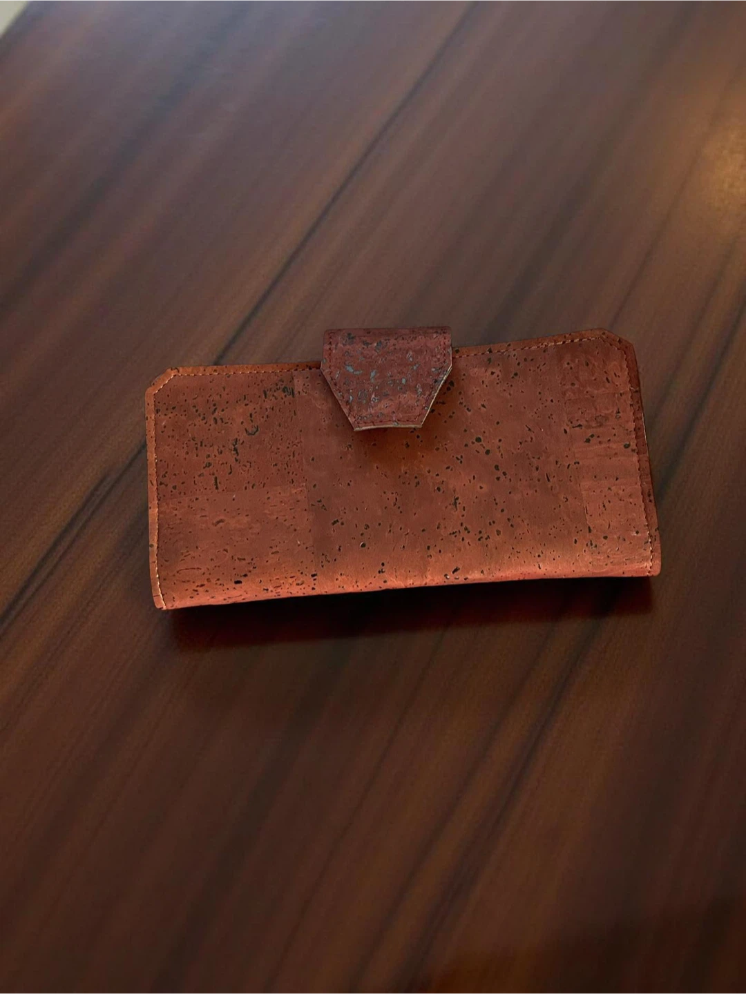 This cork clutch wallet features a snap closure and a zippered coin pocket. It's lined with 10 card slots and a clear ID window and 2 pockets for cash or checkbook. Material is beautiful, sustainable cork (vegan leather).