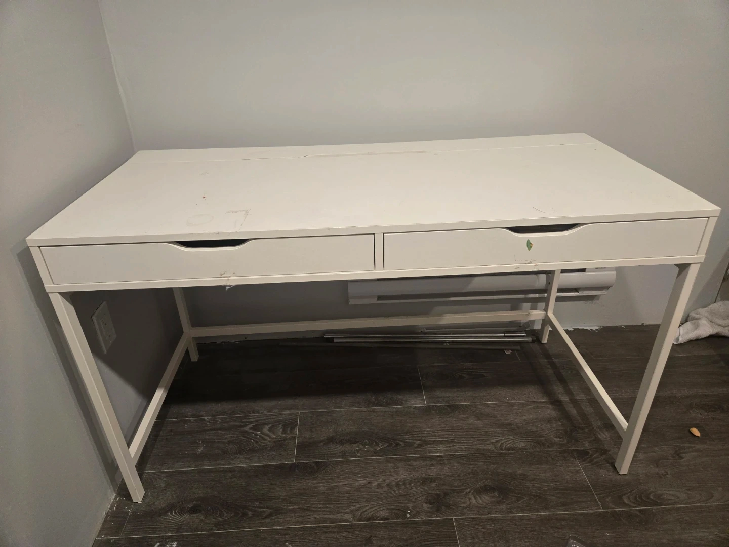 White desk with two drawers and a lift-top compartment. It's a great spot for your computer or work. Made of particleboard and metal.