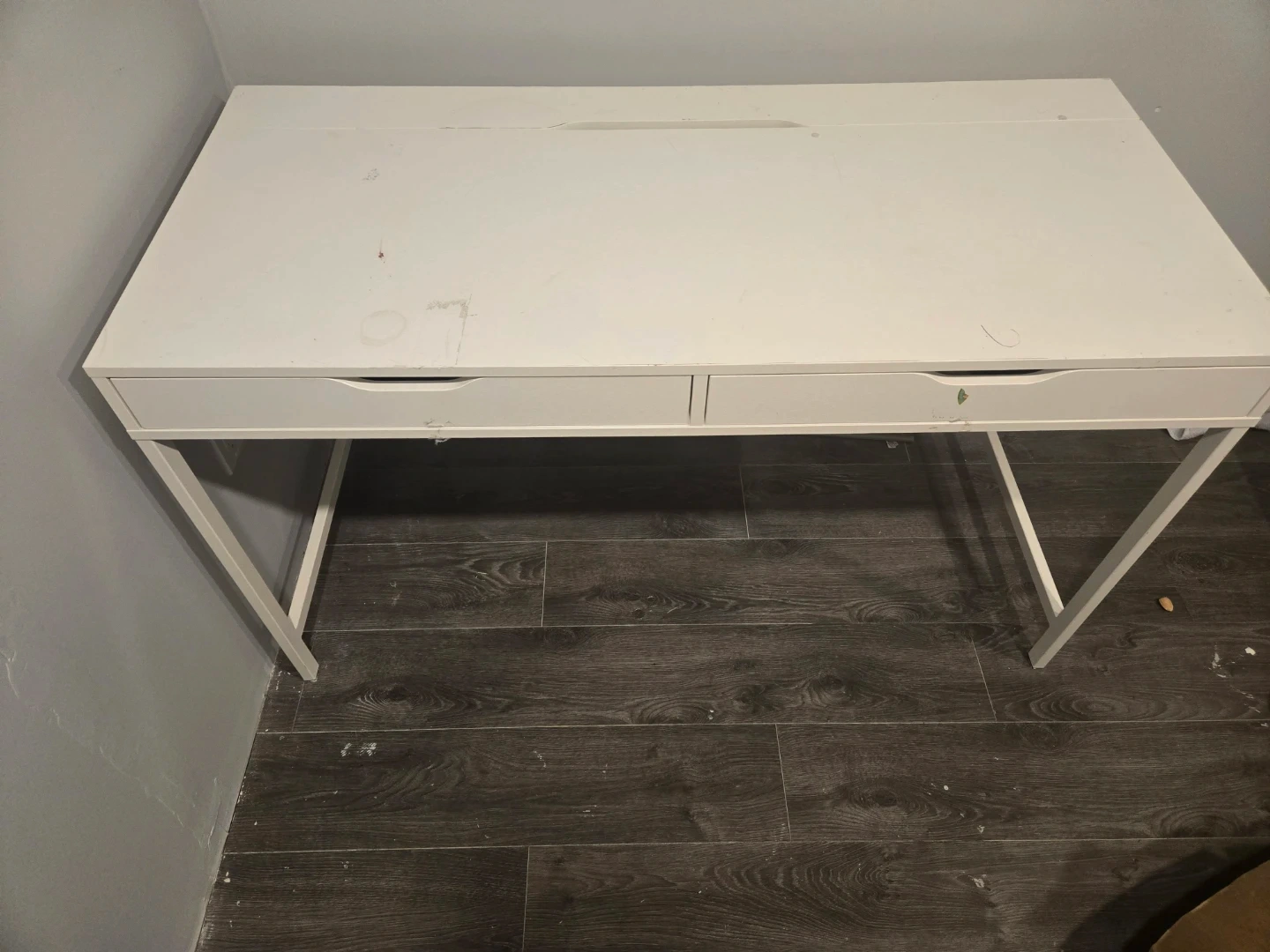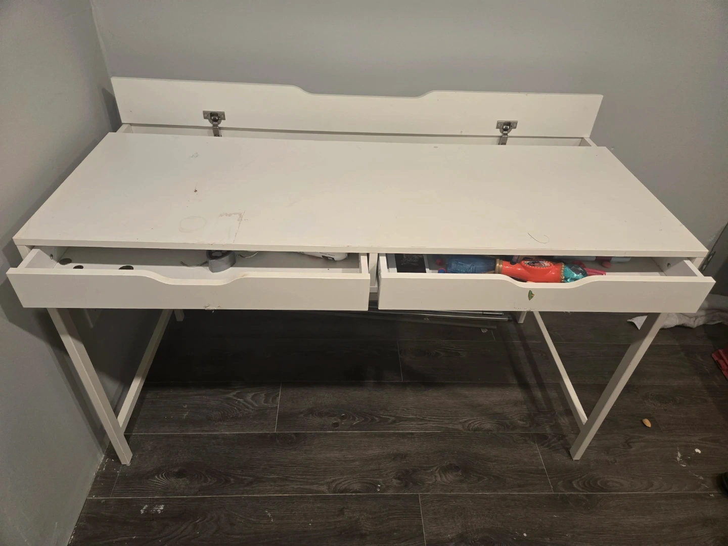 White desk with two drawers and a lift-top compartment. It's a great spot for your computer or work. Made of particleboard and metal.