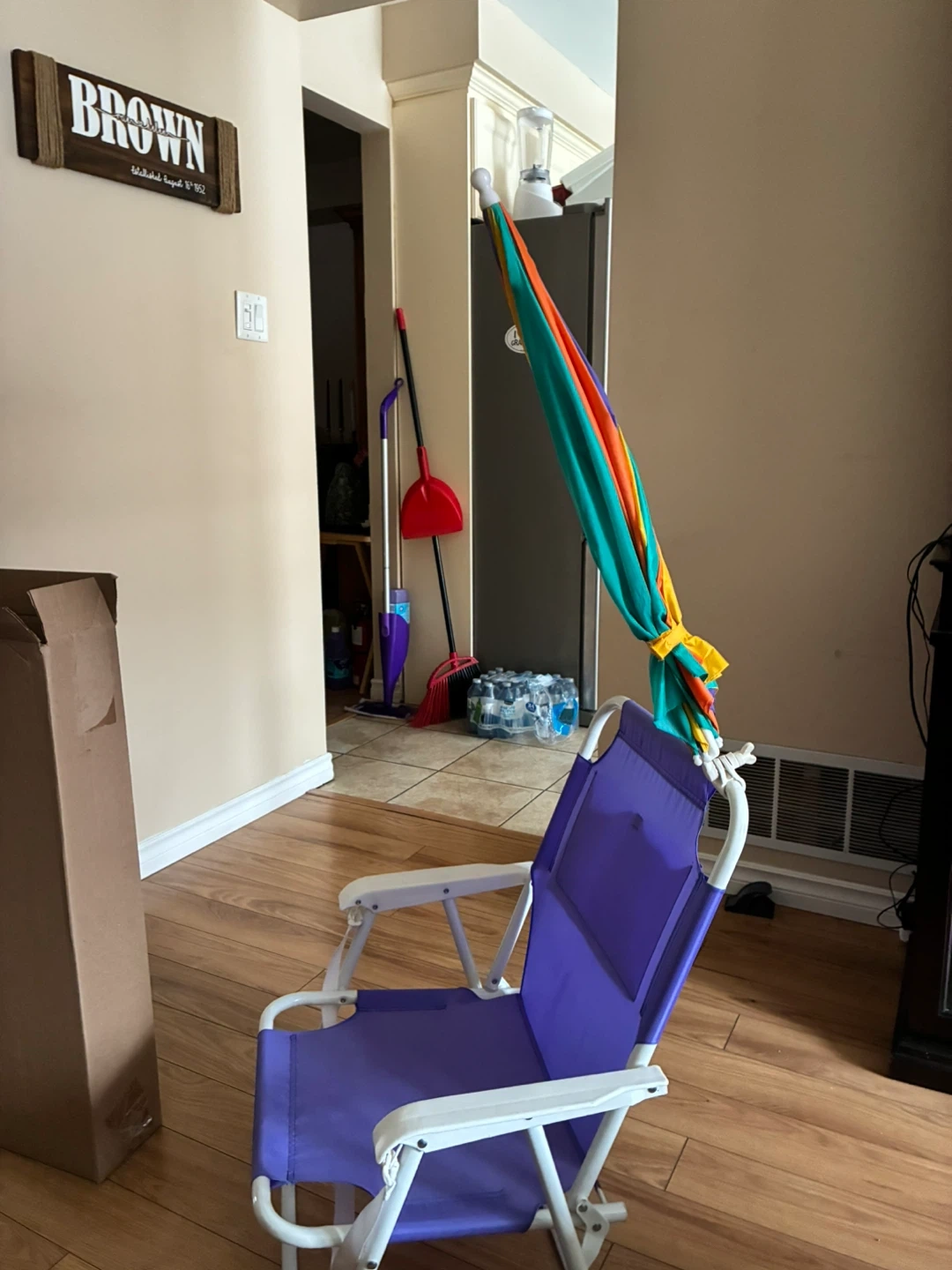 This is a portable purple beach chair with an attached, multi-coloured umbrella. It's perfect for the beach or camping! The chair has white metal armrests and a sturdy frame. Perfect for children or young adults.