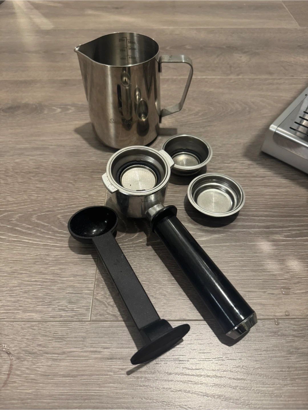 Selling a Delonghi espresso machine that's ready to make some delicious coffee! It comes with all the accessories you see in the pictures, including the milk frothing pitcher, portafilter, tamper, and several filter baskets. It's in perfect working condition and would be a great addition to any coffee lover's kitchen.