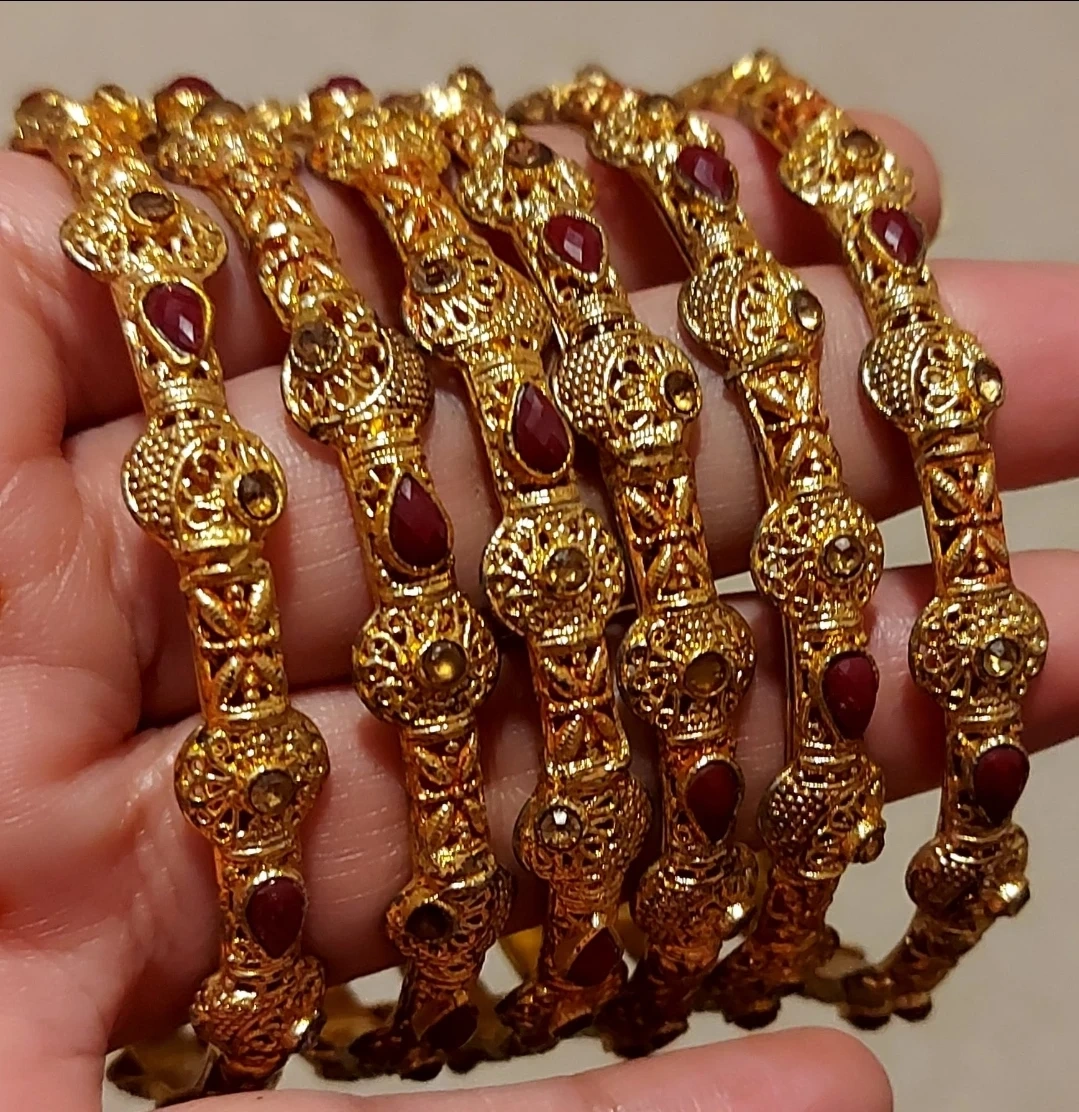 A set of six intricately designed bangles. These gold-tone bangles feature decorative patterns and are accented with red teardrop-shaped stones. They're perfect for adding a touch of elegance to traditional outfits.