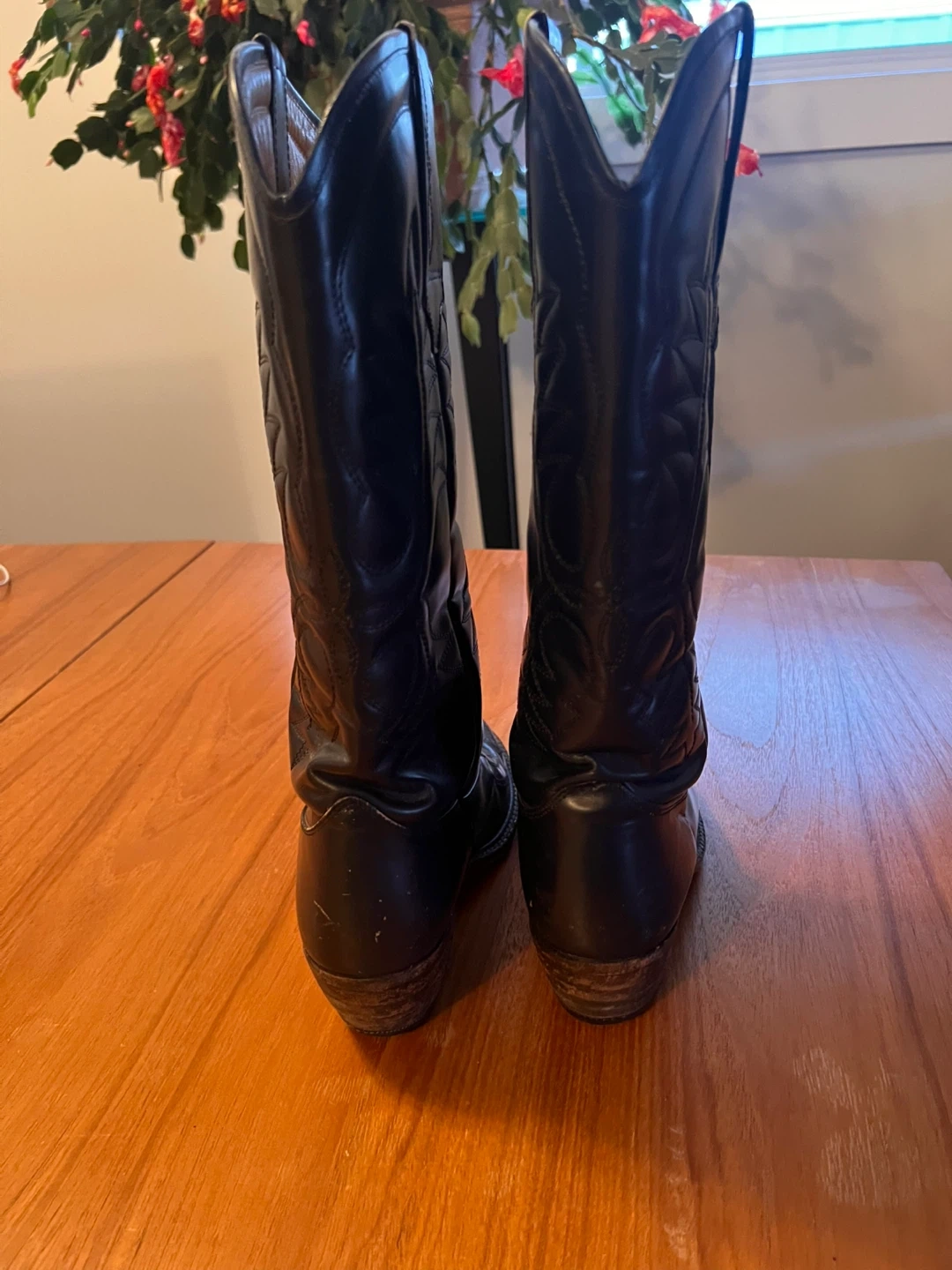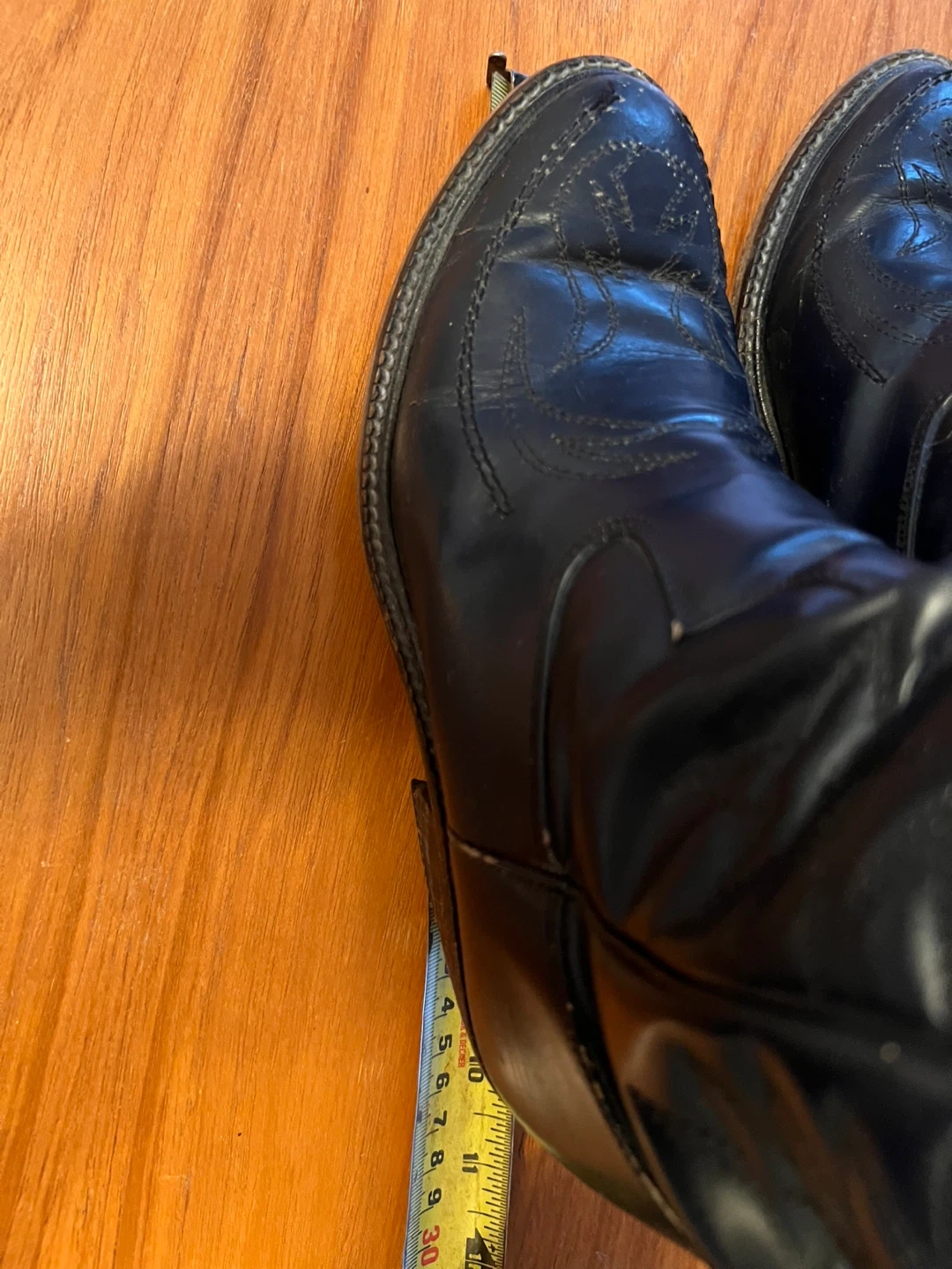 Selling a pair of navy leather cowboy boots. They show some signs of wear, particularly on the soles and toes, but are still in good condition for their age. Please see the photos for details! #Cleanout