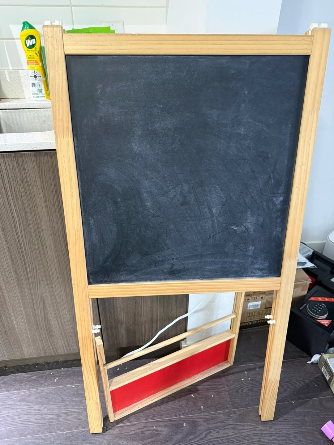 This is a wooden easel designed for kids. It features a chalkboard surface and a red tray for art supplies. It's great for little ones to get creative! Wood construction.