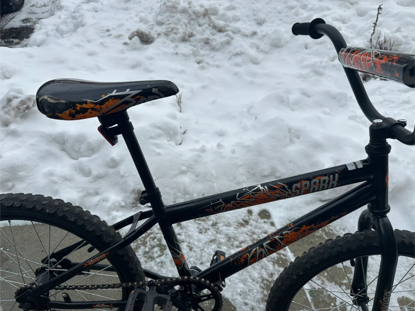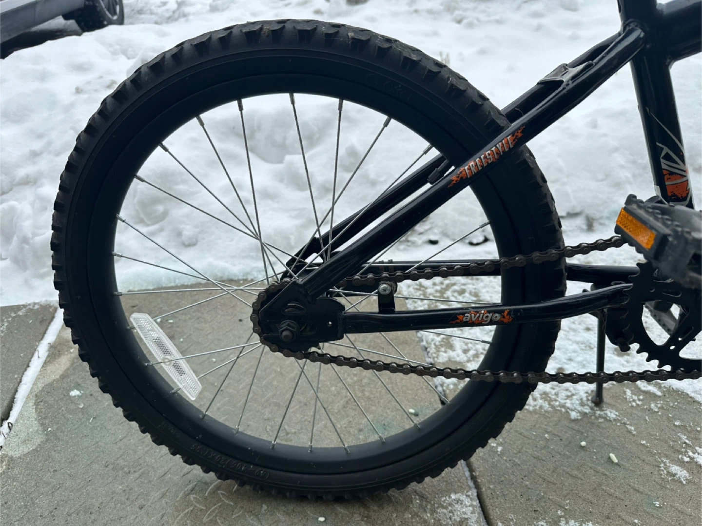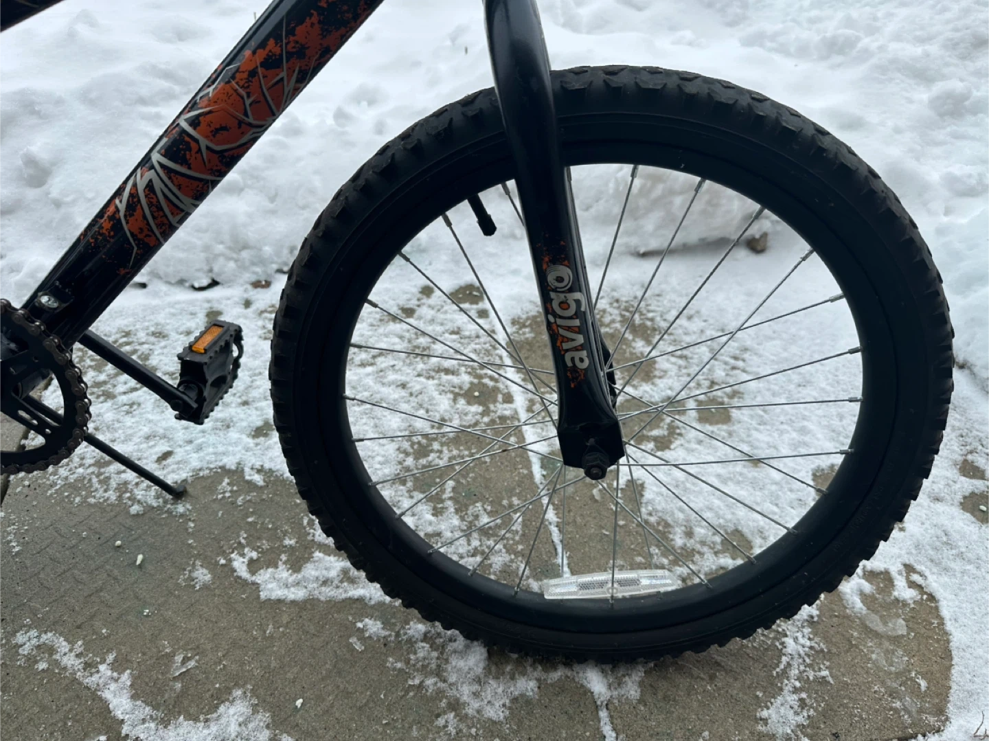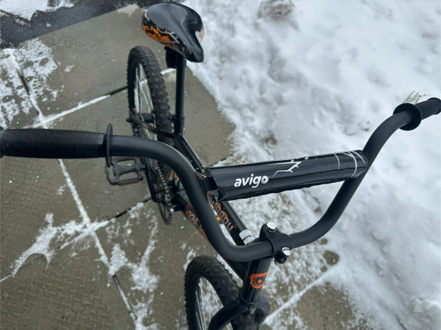 Black Avigo Spark BMX bike with orange and white accents. Features a sturdy frame and knobby tires for performance. Great for kids and teens who love to ride!