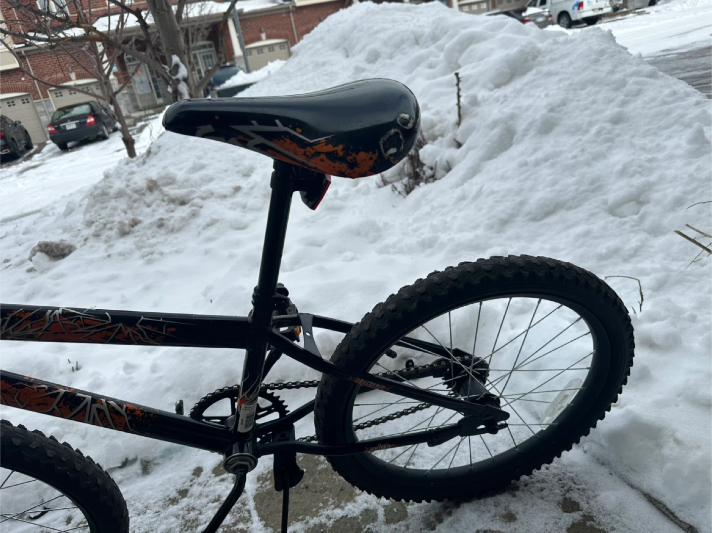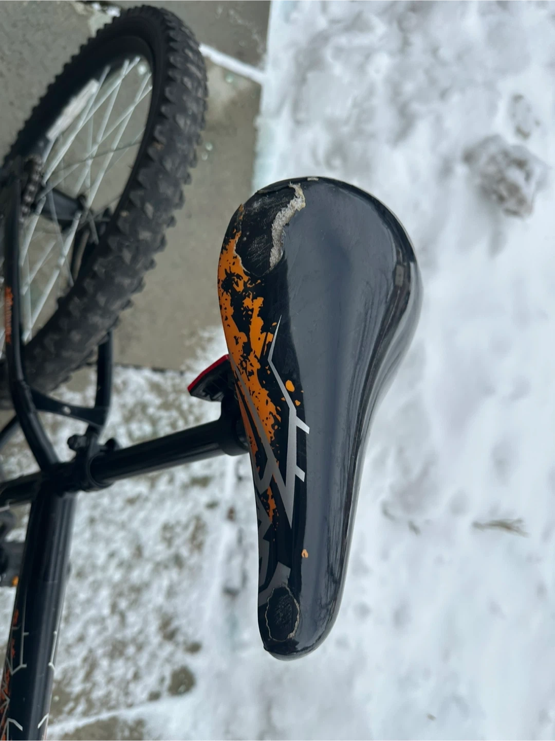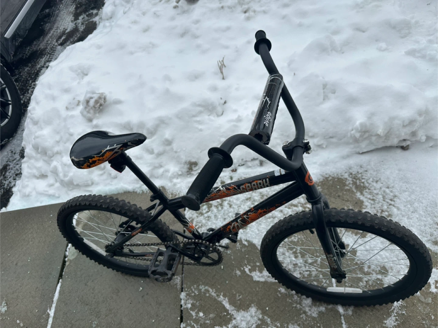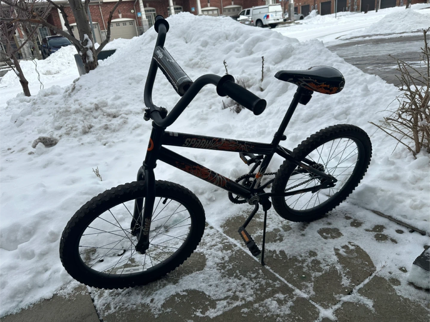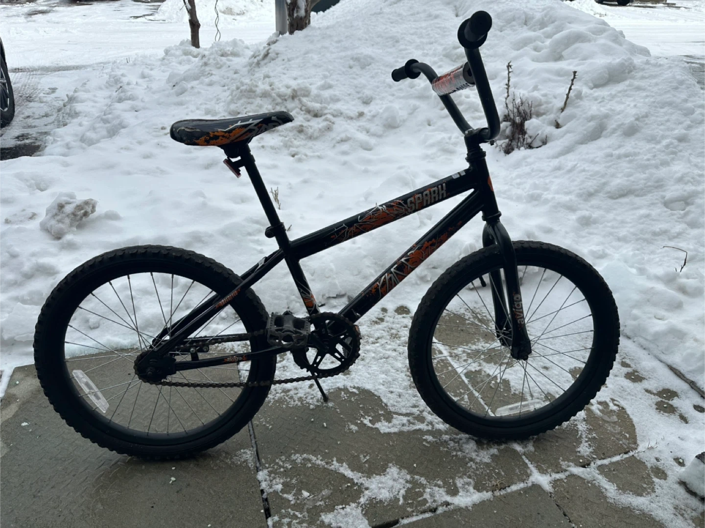 Black Avigo Spark BMX bike with orange and white accents. Features a sturdy frame and knobby tires for performance. Great for kids and teens who love to ride!