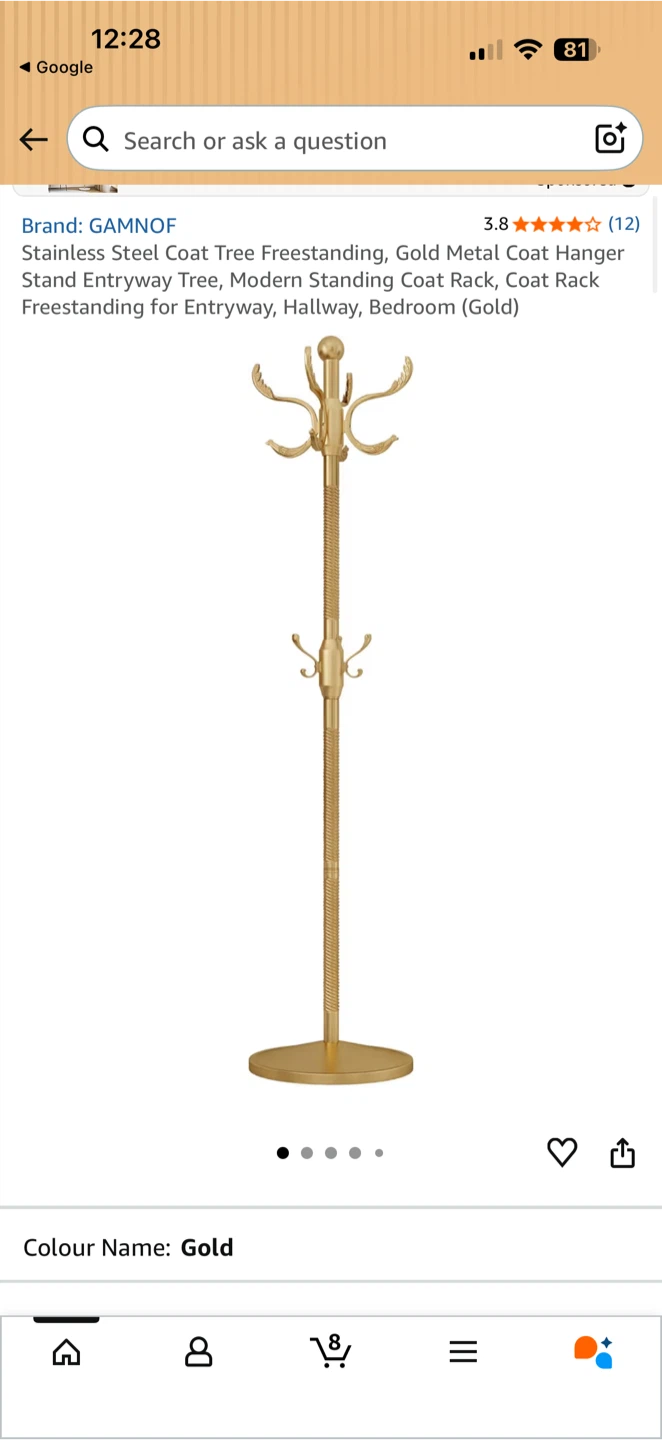 Freestanding coat rack from GAMNOF in a gold finish. Made of stainless steel. Offers multiple hooks for hanging coats and accessories.