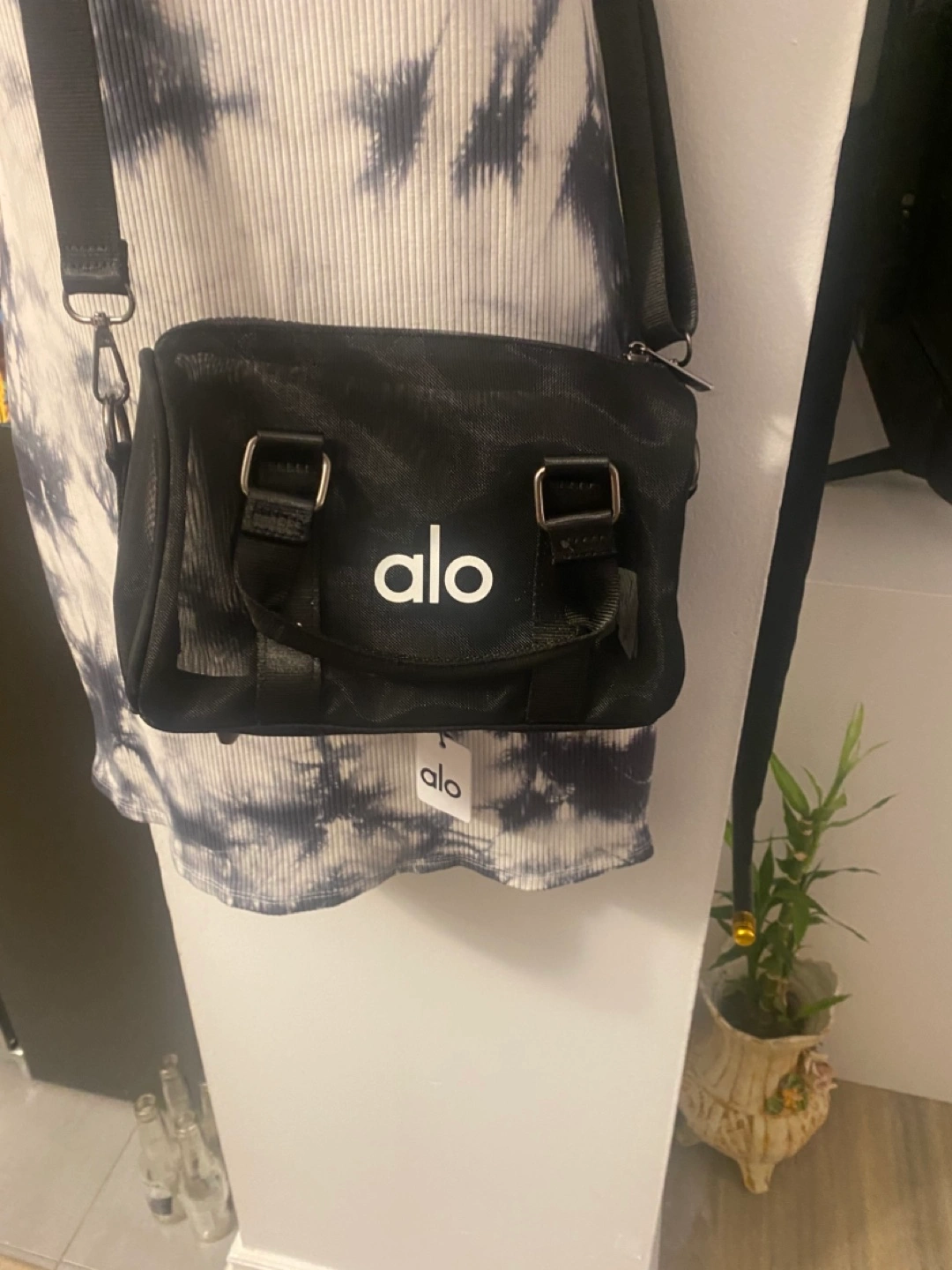 Small black mesh crossbody bag. Features a main compartment and adjustable strap. Alo Yoga branding. Perfect for carrying essentials.waterproof