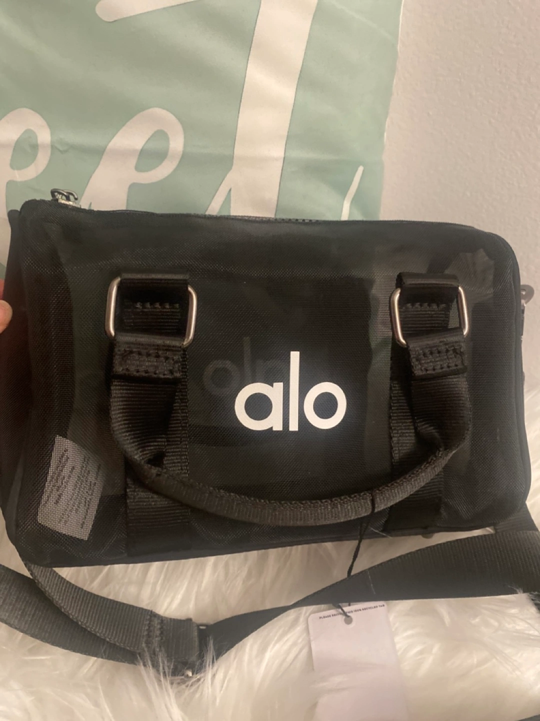 Small black mesh crossbody bag. Features a main compartment and adjustable strap. Alo Yoga branding. Perfect for carrying essentials.waterproof