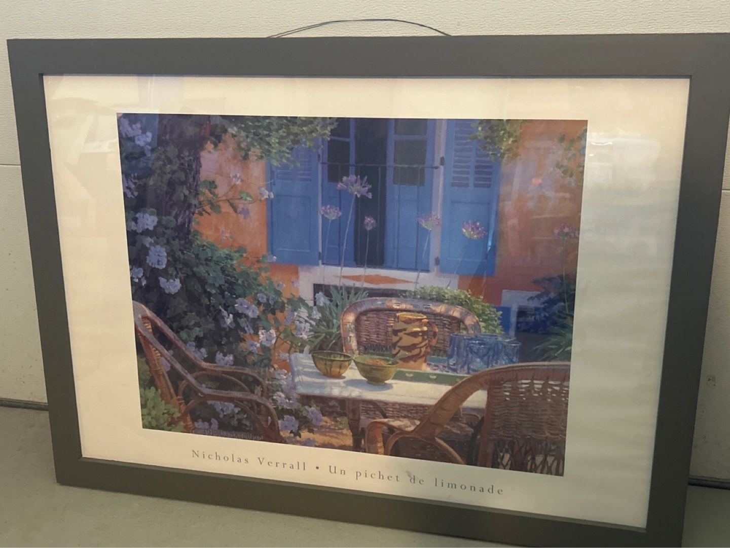 Wood Framed art print. Plexiglass not glass. Depicts a patio scene with wicker chairs and a table. Features blue shutters and flowering plants. Artist is Nicholas Verrall. Titled 'Un Piche De Limonade'.