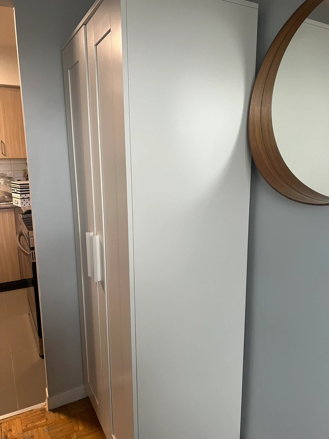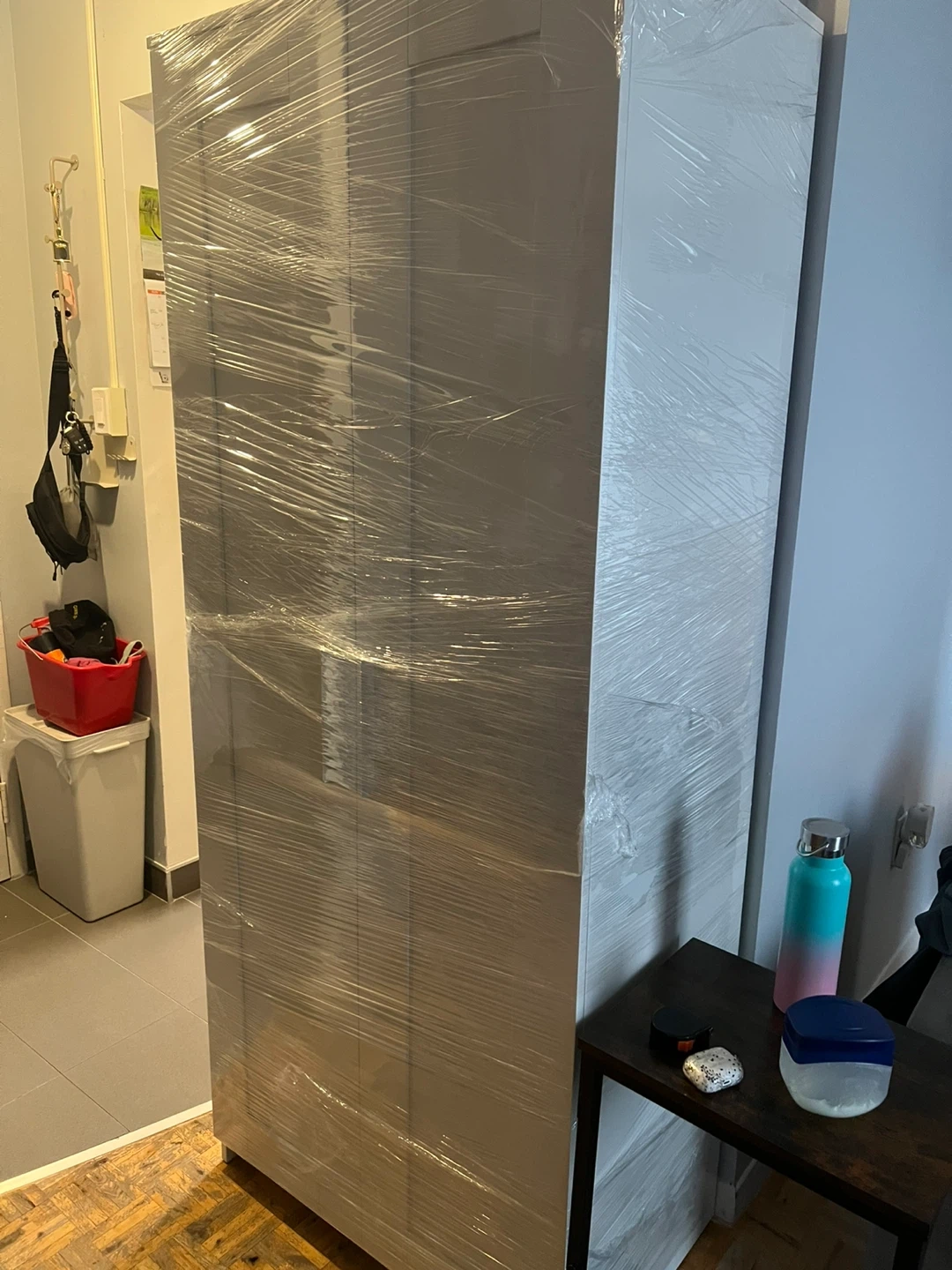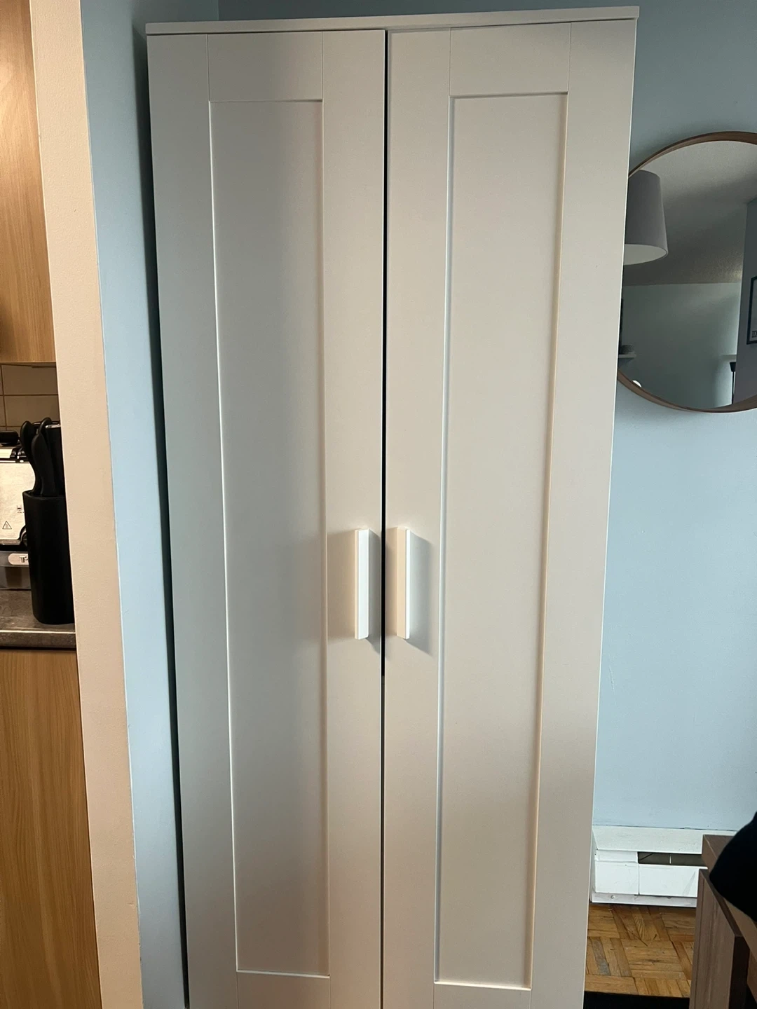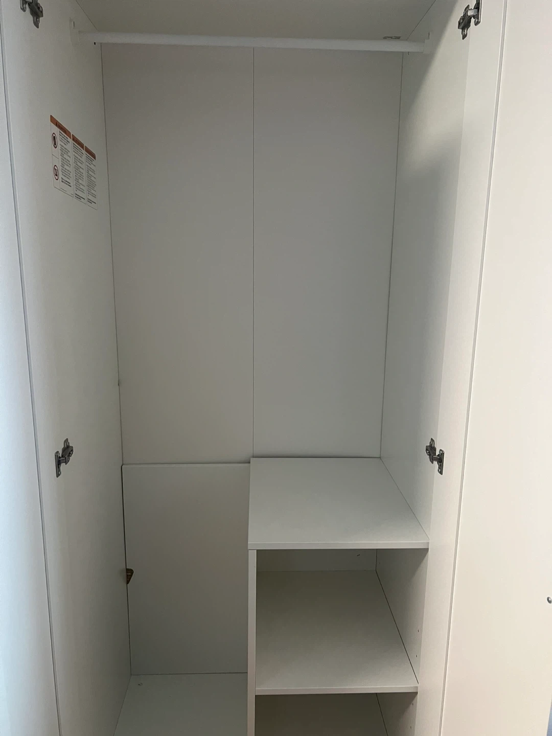 White double door wardrobe with a hanging rod and shelves. It's a great storage solution for any bedroom or closet! This wardrobe is ready for transport.