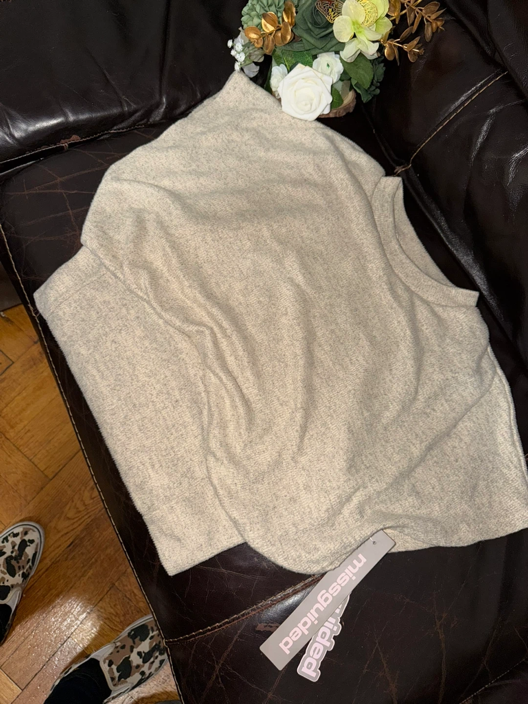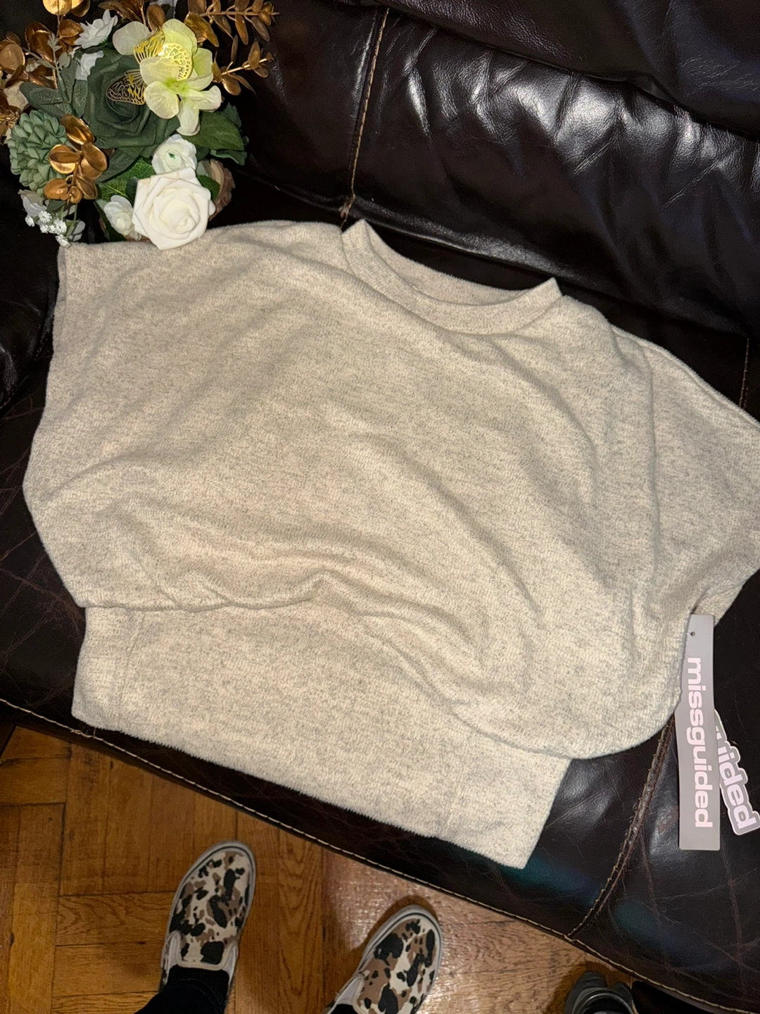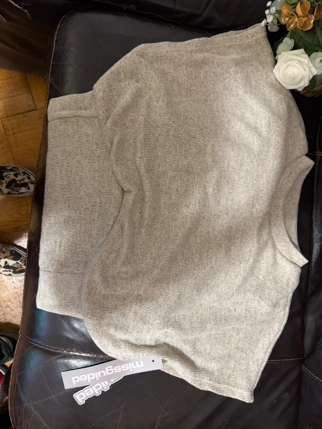 Cozy knit sweater from Missguided. It's a beige, oversized fit with a crew neck. Made of a soft, textured material. Size L.