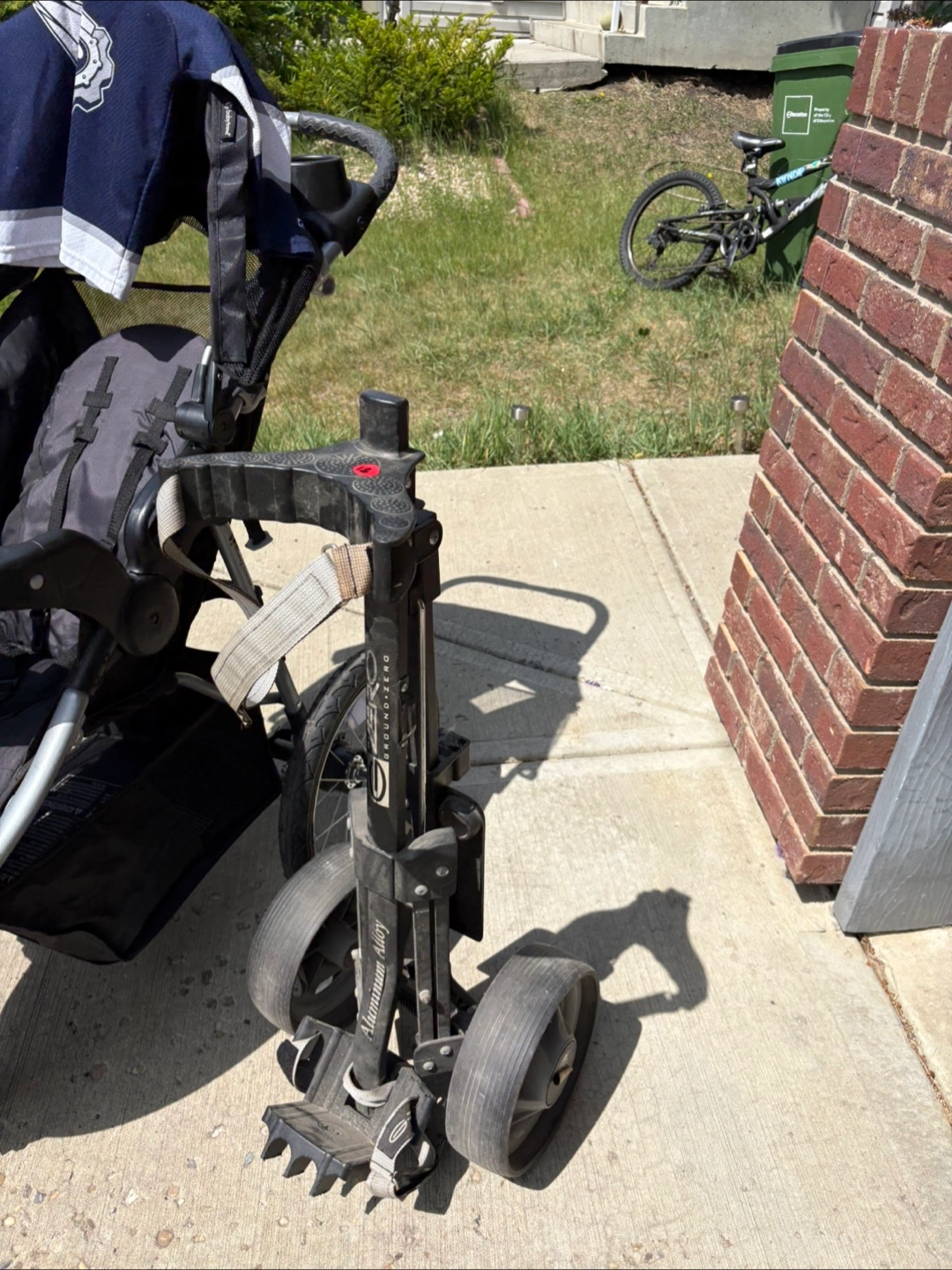Offering a golf cart in good condition. Features three wheels. Made of aluminum alloy, the cart is sturdy. Think of all the walks you could take with this cart helping you along, and you will find yourself in peace.