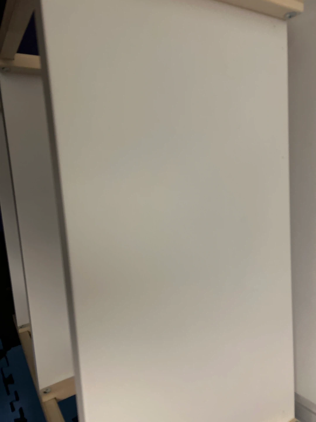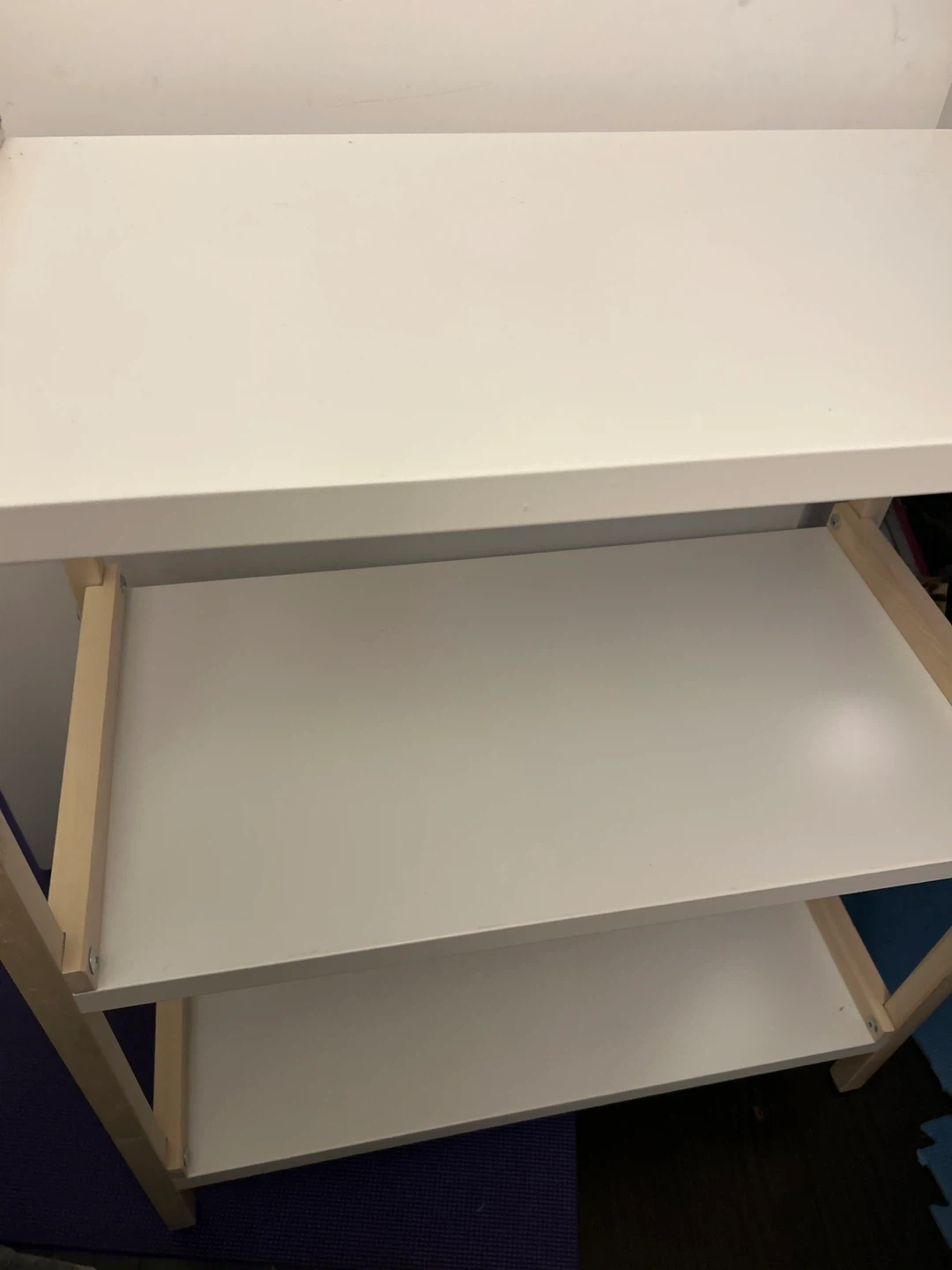 A simple white 3-tier shelf unit with a wooden frame. It's perfect for organizing books, decor, or other items in your home. The shelves are a light beige colour, providing a neutral and clean look.