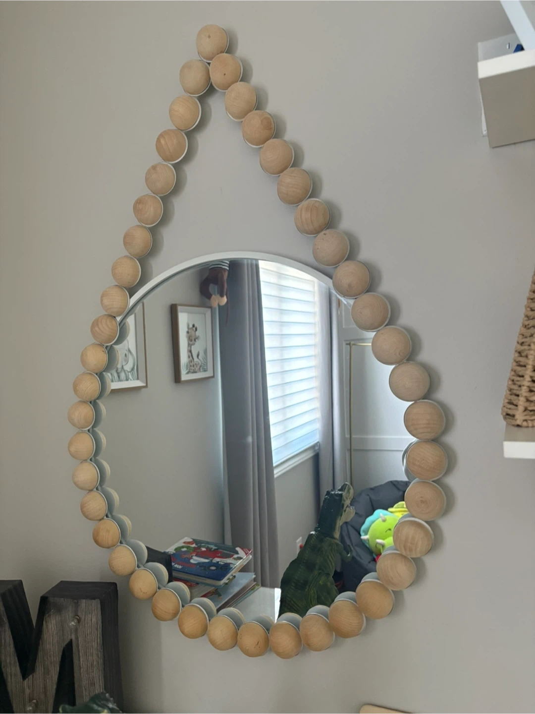 This teardrop-shaped mirror is adorned with natural wood beads around its edge. It's a charming decorative piece for any room. Adds a cozy, boho touch!
